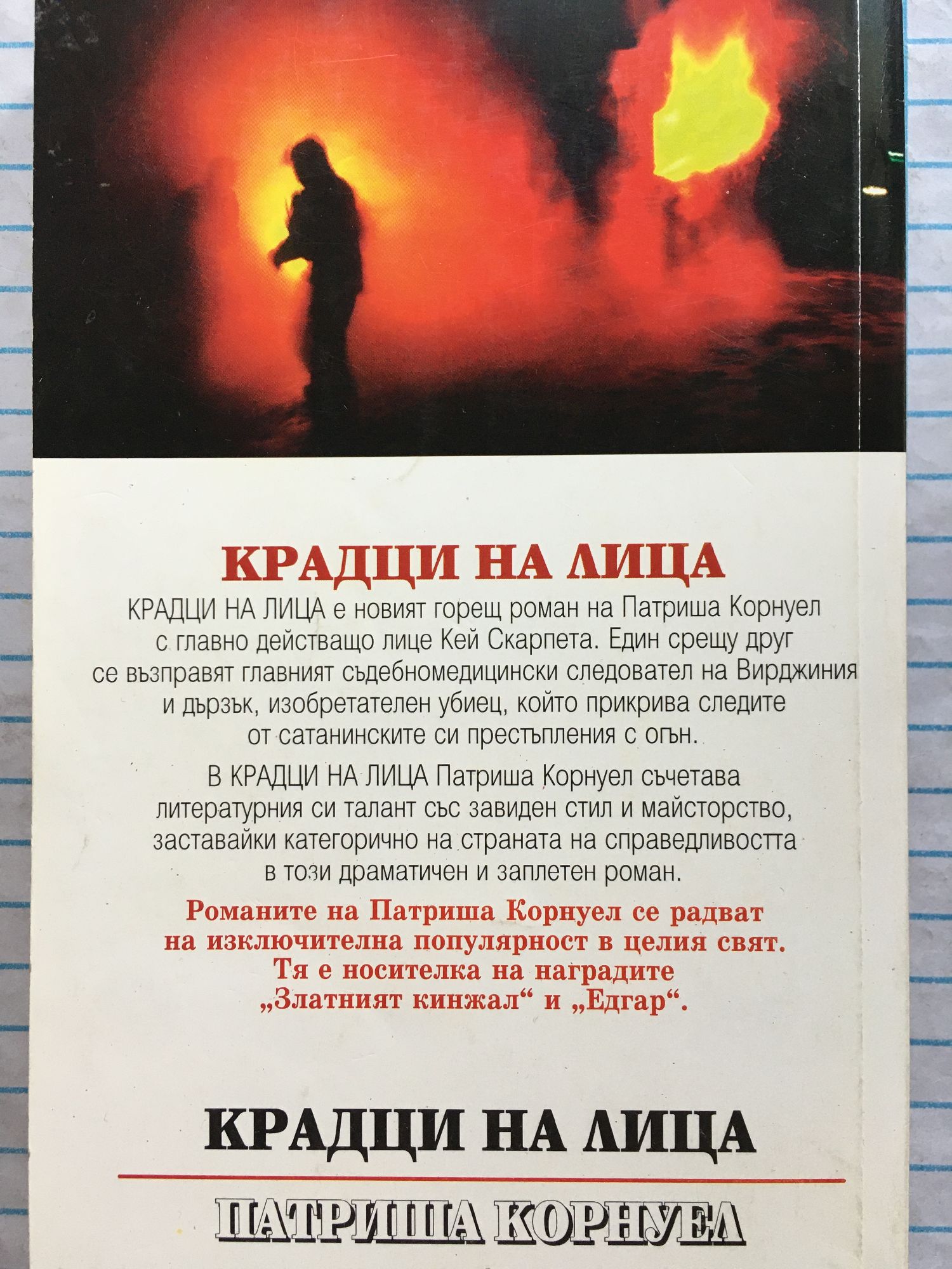 „Крадци на лица“ е новият горещ роман на Патриша Корнуел с главно действащо лице Кей Скарпета. Един срещу друг се възправят главният съдебномедицински следовател на Вирджиния и дързък, изобретателен убиец, който прикрива следите от сатанинските си престъпления с огън. В „Крадци на лица“ Патриша Корнуел съчетава литературния си талант със завиден стил и майсторство, заставайки категорично на страната на справедливостта в този драматичен и заплетен роман. Романите на Патриша Корнуел се радват на изключителна популярност в целия свят. Тя е носителка на наградите „Златният кинжал“ и „Едгар“.