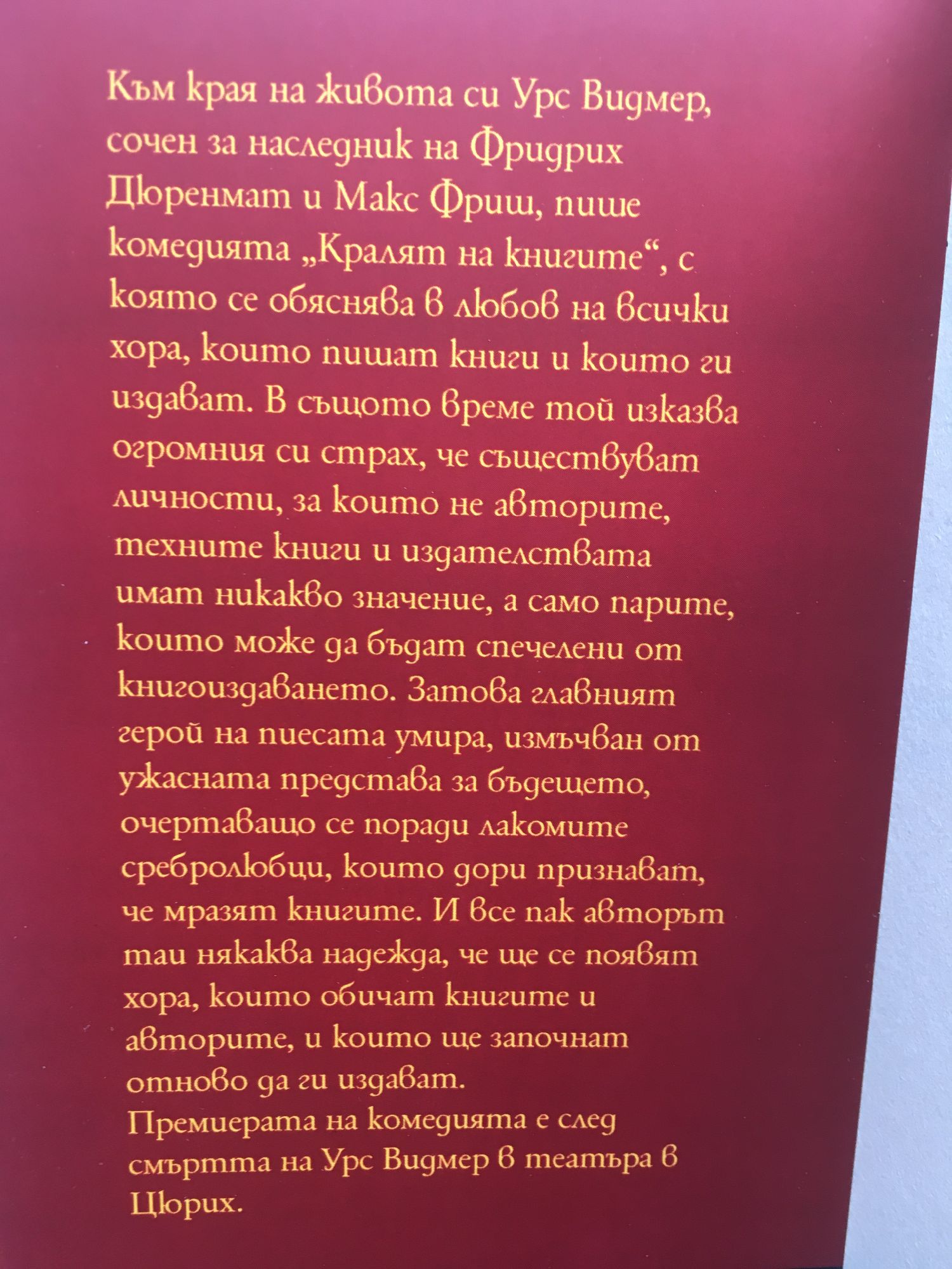 Към края на живота си Урс Видмер, сочен за наследник на Фридрих Дюренмат и Макс Фриид, пише комедията „Кралят на книгите", с която се обяснява в любов на всички хора, които пишат книги и които ги издават. В същото време той изказва огромния си страх, че съществуват личности, за които не авторите, техните книги и издателствата имат някакво значение, а само парите, които може да бъдат спечелени от книгоиздаването. Затова главният герой на пиесата умира, измъчван от ужасната представа за бъдещето, очертаващо се поради лакомите сребролюбци, които дори признават, че мразят книгите. И все пак авторът таи някаква надежда, че ще се появят хора, които обичат книгите и авторите, и които ще започнат отново да ги издават. Премиерата на комедията е след смъртта на Урс Видмер в театъра в Цюрих.
