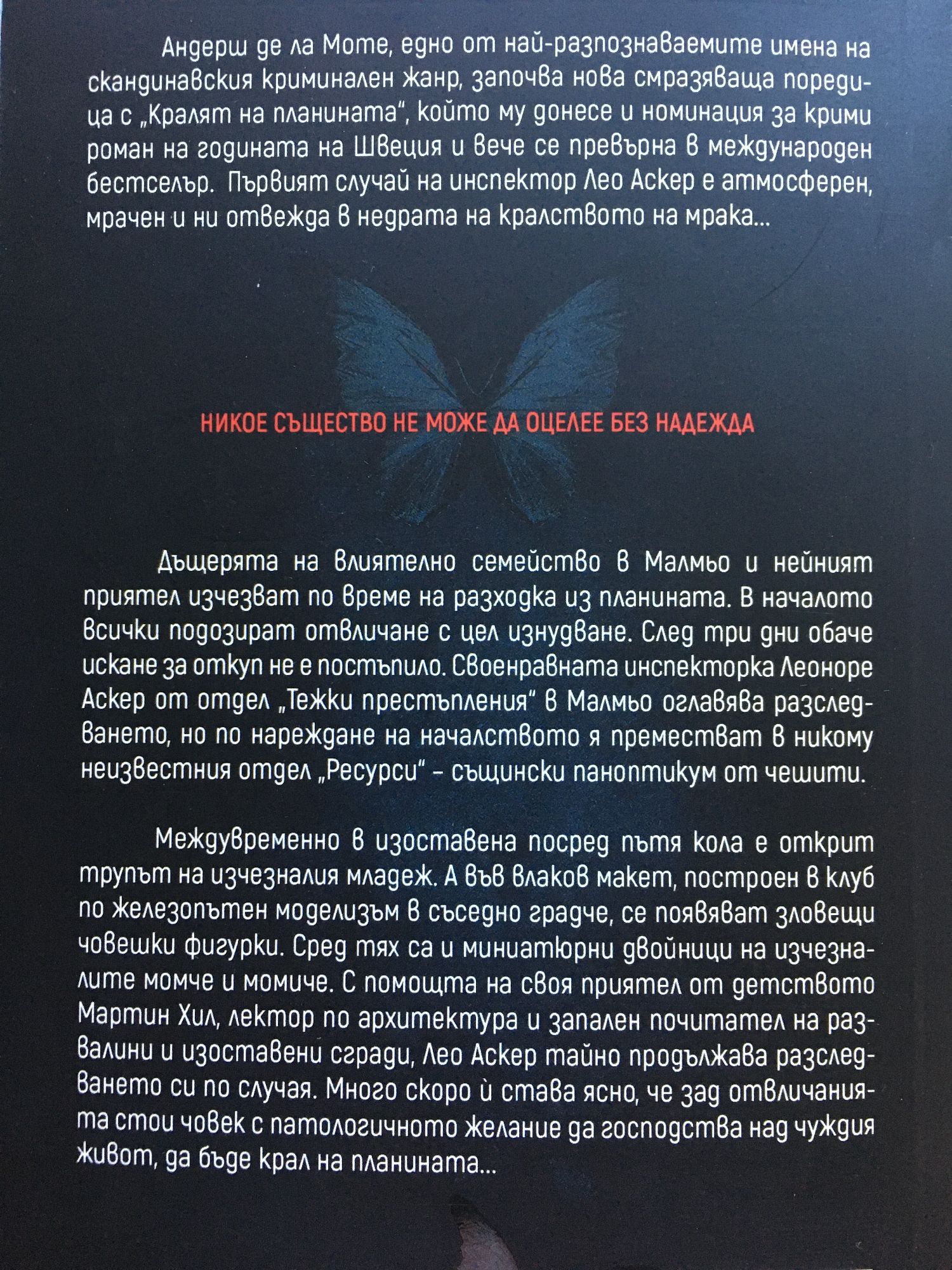 Андерш де ла Моте, едно от най-разпознаваемите имена на скандинавския криминален жанр, започва нова смразяваща поредица с „Кралят на планината“, който му донесе и номинация за крими роман на годината на Швеция и вече се превърна в международен бестселър. Първият случай на инспектор Лео Аскер е атмосферен, мрачен и ни отвежда в недрата на кралството на мрака... Никое същество не може да оцелее без надежда Дъщерята на влиятелно семейство в Малмьо и нейният приятел изчезват по време на разходка из планината. В началото всички подозират отвличане с цел изнудване. След три дни обаче искане за откуп не е постъпило. Своенравната инспектор Леоноре Аскер от отдел „Тежки престъпления“ в Малмьо оглавява разследването, но по нареждане на началството я преместват в никому неизвестния отдел „Ресурси“ – същински паноптикум от чешити. Междувременно в изоставена посред пътя кола е открит трупът на изчезналия младеж. А във влаков макет, построен в клуб по железопътен моделизъм в съседно градче, се появяват зловещи човешки фигурки. Сред тях са и миниатюрни двойници на изчезналите момче и момиче. С помощта на своя приятел от детството Мартин Хил, лектор по архитектура и запален почитател на развалини и изоставени сгради, Лео Аскер тайно продължава разследването си по случая. Много скоро ѝ става ясно, че зад отвличанията стои човек с патологичното желание да господства над чуждия живот, да бъде крал на планината..