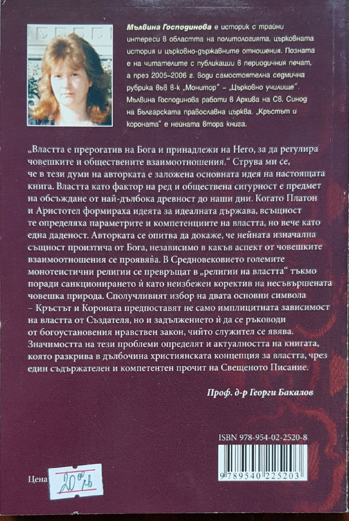 Темата за властта е една от онези теми, които винаги остават открити за още размисли, анализи и поуки. В този смисъл настоящата книга е опит да се припомни отново и да се осветли тема, която векове наред е била актуална и обществено значима. Това е въпроса за Божествения произход на властта и нейните изначални проявления в обществения живот – духовната и светската власт. Авторката анализира произхода, предназначението и идеала на властта.