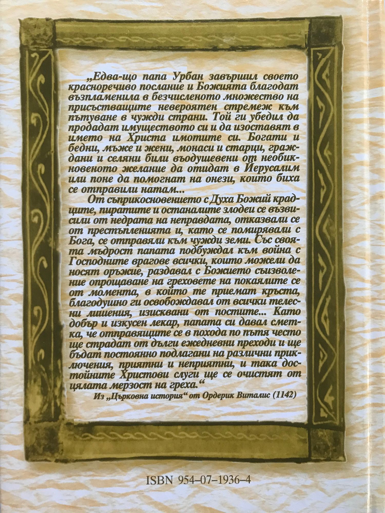 „Едва-що папа Урбан завършил своето красноречиво послание и Божията благодат възпламенила в безчисленото множество на присъстващите невероятен стремеж към пътуване в чужди страни. Той ги убедил да продадат имуществото си и да изоставят в името на Христа имотите си. Богати и бедни, мъже и жени, монаси и старци, граждани и селяни били въодушевени от необикновеното желание да отидат в Йерусалим или поне да помогнат на онези, които биха се отправили натам... От съприкосновението с Духа Божий крадците, пиратите и останалите злодеи се възвисили от недрата на неправдата, отказвали се от престъпленията и, като се помирявали с Бога, се отправяли към чужди земи. Със своята мъдрост папата подбуждал към война с Господните врагове всички, които можели да носят оръжие, раздавал с Божието съизволение опрощаване на греховете на покаялите се от момента, в които те приемат кръста, благодушно ги освобождавал от всички телесни лишения, изисквани от постите... Като добър и изкусен лекар, папата си давал сметка, че отправящите се в похода по пътя често ще страдат от дълги ежедневни преходи и ще бъдат постоянно подлагани на различни приключения, приятни и неприятни, и така достойните Христови слуги ще се очистят от цялата мерзост на греха.” Из „Църковна история" от Ордерик Виталис (1142)