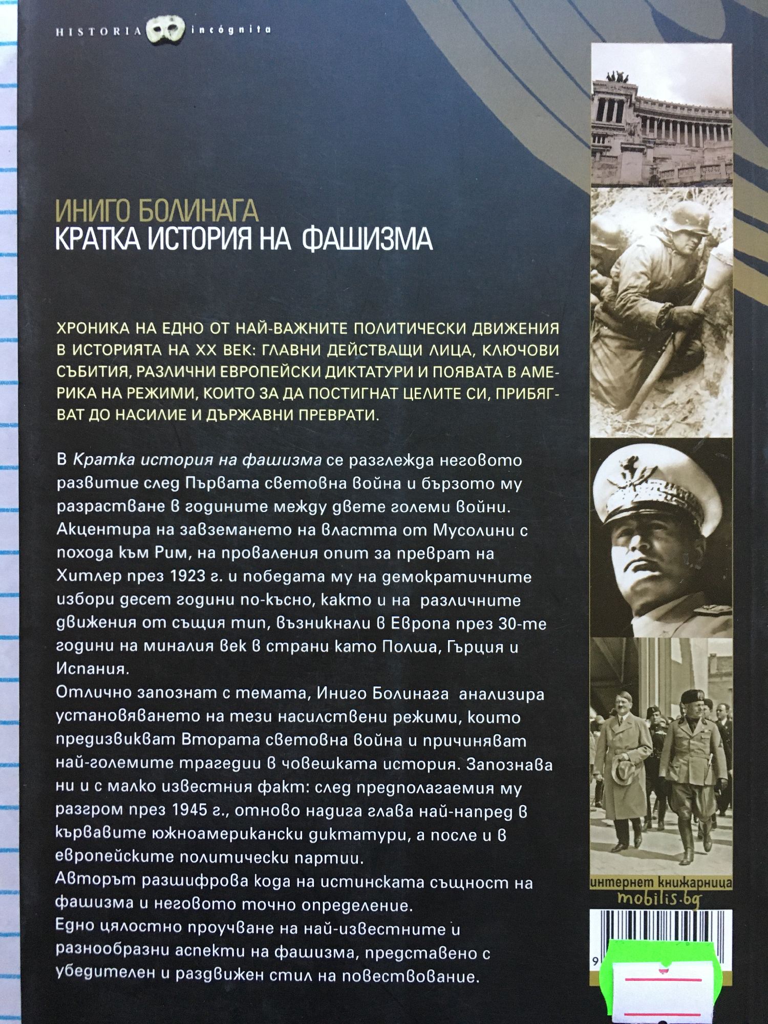 Хроника на едно от най-важните политически движения в историята на ХХ век: главни действащи лица, ключови събития, различни европейски диктатури и появата в Америка на режими, които за да постигнат целите си, прибягват до насилие и държавни преврати. В „Кратка история на фашизма” се разглежда неговото развитие след Първата световна война и бързото му разрастване в годините между двете големи войни. Акцентира на завземането на властта от Мусолини с похода към Рим, на проваления опит за преврат на Хитлер през 1923 г. и победата му на демократичните избори десет години по-късно, както и на различните движения от същия тип, възникнали в Европа през 30-те години на миналия век в страни като Полша, Гърция и Испания. Отлично запознат с темата, Иниго Болинага анализира установяването на тези насилствени режими, които предизвикват Втората световна война и причиняват най-големите трагедии в човешката история. Запознава ни и с малко известния факт: след предполагаемия му разгром през 1945 г., отново надига глава най-напред в кървавите южноамерикански диктатури, а после и в европейските политически партии. Авторът разшифрова кода на истинската същност на фашизма и неговото точно определение. Едно цялостно проучване на най-известните и разнообразни аспекти на фашизма, представено с убедителен и раздвижен стил на повествование. Знаете ли, че… … преди да основе Фашистката партия, Мусолини е бил един от най-харизматичните лидери на Социалистическата партия? … Ленин горещо е приветствал победата на Мусолини в Социалистическата партия през 1912 г.? … фалангистите са представили на Хитлер проект за свалянето на Франко, за да могат да установят истински фашистки режим в Испания! … имало руски фашисти, които приели и служили на Сталин, приемайки го като от години очаквания харизматичен имперски лидер? … португалският диктатор Оливейра Салазар се обявявал против нацистко-фашистките режими и винаги е бил привърженик на западните сили? … съществува политическо течение, насочено към обединяване на комунизма и фашизма в една обща идеологическа платформа?