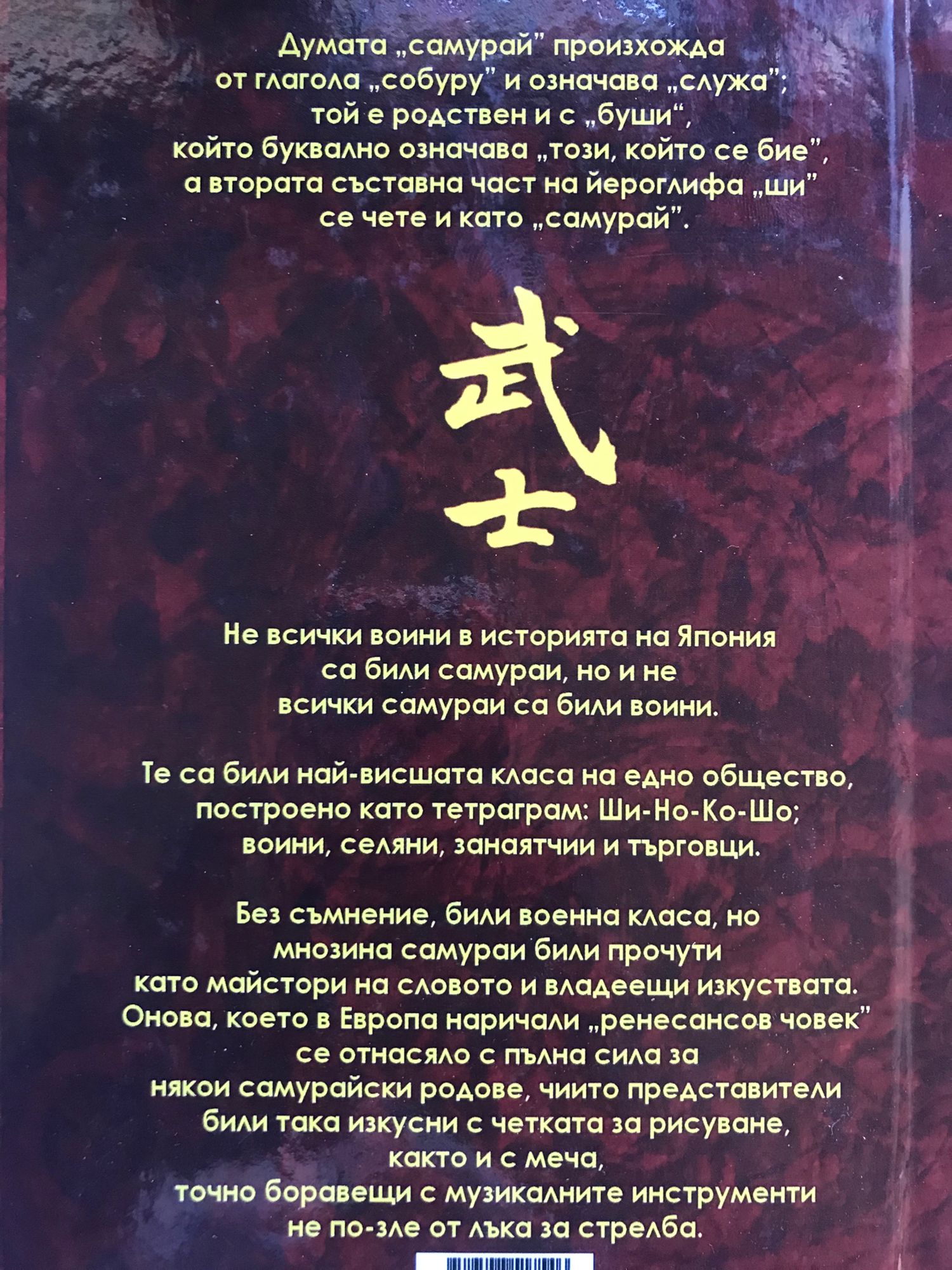Не всички воини в историята на Япония са били самураи, но и не всички самураи са били воини. Те са били най-висшата класа на едно общество, построено като тетраграм: Ши-Но-Ко-Шо; воини, селяни, занаятчии и търговци. Без съмнение били военна класа, но мнозина самураи били прочути като майстори на словото и владеещи изкуствата. Онова, което в Европа наричали "ренесансов човек" се отнасяло с пълна сила за някои самурайски родове, чиито представители били така изкусни с четката за рисуване, както и с меча, точно боравещи с музикалните инструменти не по-зле от лъка за стрелба.