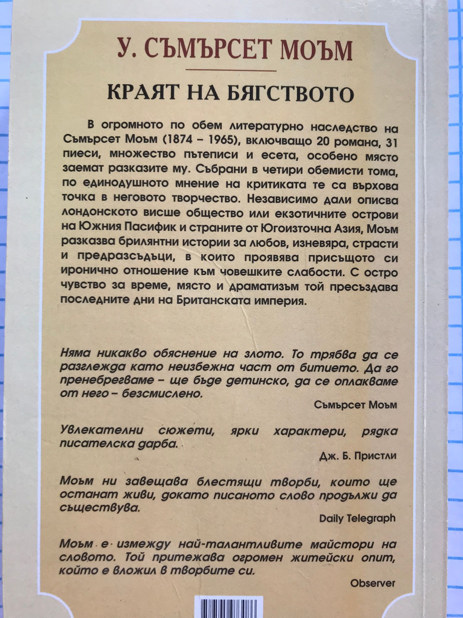 В огромното по обем литературно наследство на Съмърсет Моъм (1874-1965), включващо 20 романа, 31 пиеси, множество пътеписи и есета, особено място заемат разказите му. Събрани в четири обемисти тома, по единодушното мнение на критиката те са върхова точка в неговото творчество. Независимо дали описва лондонското висше общество или екзотичните острови на Южния Пасифик и страните от Югоизточна Азия, Моъм разказва брилянтни истории за любов, изневяра, страсти и предразсъдъци, в които проявява присъщото си иронично отношение към човешките слабости. С остро чувство за време, място и драматизъм той пресъздава последните дни на Британската империя. "Няма никакво обяснение за злото. То трябва да се разглежда като неизбежна част от битието. Да го пренебрегваме - ще бъде детинско, да се оплакваме от него - безмислено." Съмърсет Моъм