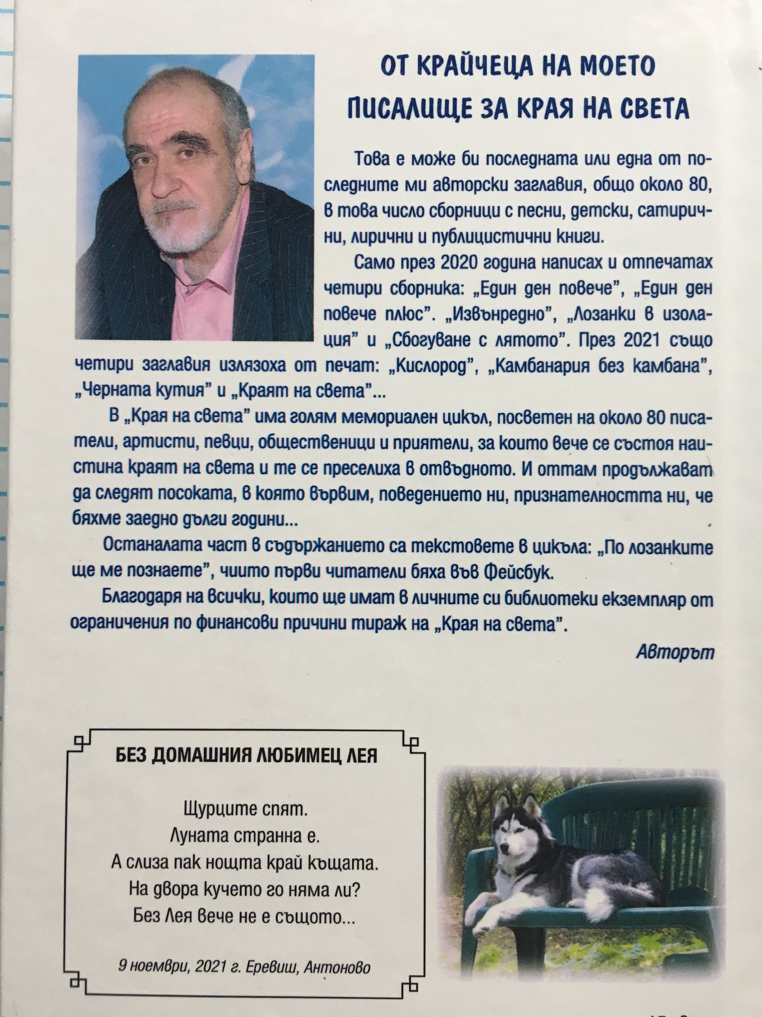 Това е може би последното или едно от последните ми авторски заглавия, общо около 80, в това число сборници с песни, детски, сатирични, лирични и публицистични книги. Само през 2020 година написах и отпечатах четири сборника: "Един ден повече", "Един ден повече плюс", "Извънредно", "Лозанки в изолация" и "Сбогуване с лятото". През 2021-ва също четири заглавия излязоха от печат: "Кислород", "Камбанария без камбана", "Черната кутия" и "Краят на света"... В "Краят на света" има голям мемориален цикъл, посветен на 80 писатели, артисти, певци, общественици и приятели, за които вече се състоя наистина краят на света и те се преселиха в отвъдното. И оттам продължават да следят посоката, в която вървим, поведението ни, признателността ни, че бяхме заедно дълги години... Останалата част в съдържанието са текстовете в цикъла "По лозанките ще ме познаете", чиито първи читатели бяха във фейсбук. Благодаря на всички, които ще имат в личните си библиотеки екземпляр от ограничения по финансови причини тираж на "Краят на света". Авторът