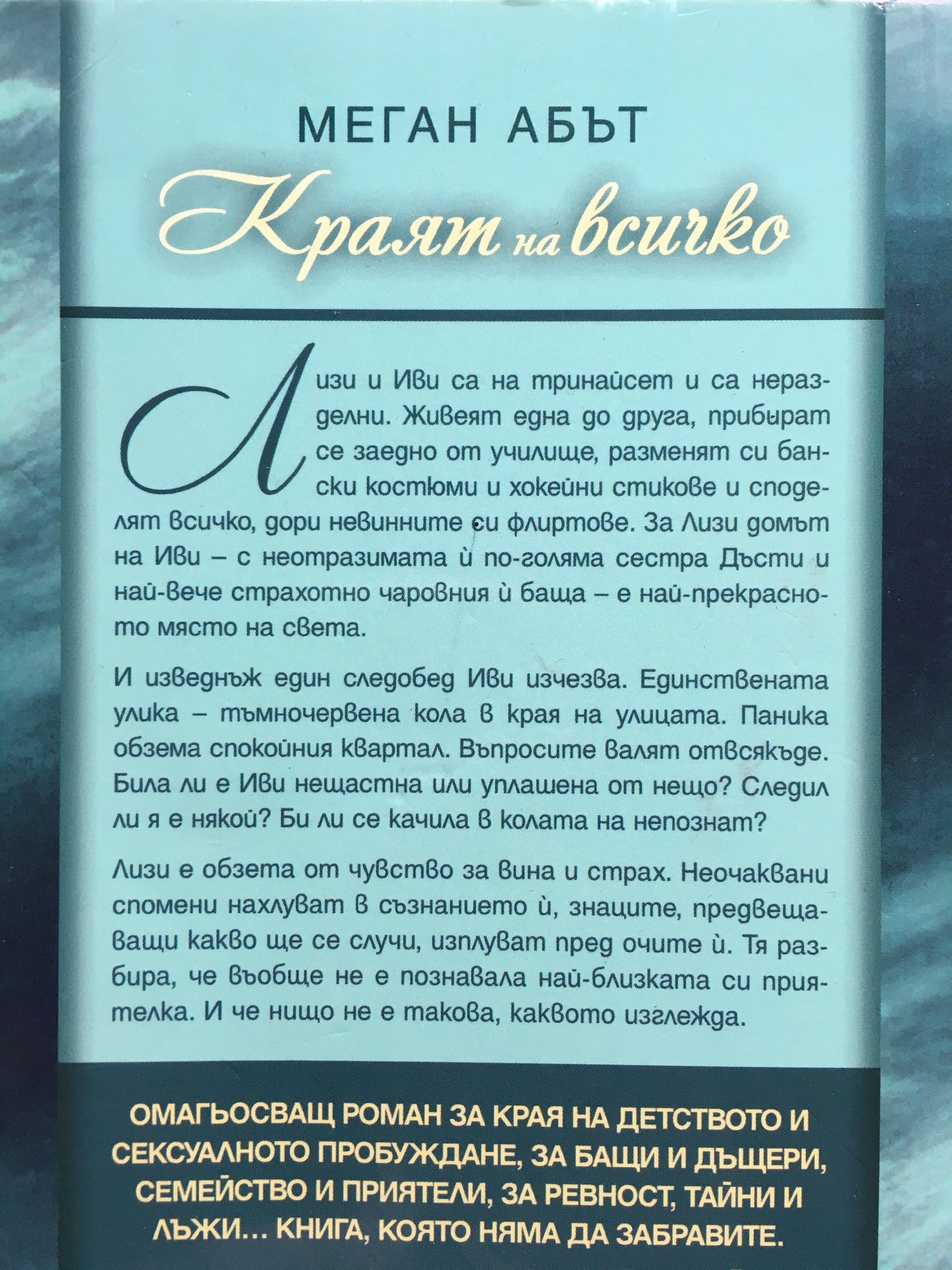 Лизи и Иви са на тринайсет и са неразделни. Живеят една до друга, прибират се заедно от училище, разменят си бански костюми и хокейни стикове и споделят всичко, дори невинните си флиртове. За Лизи домът на Иви – с неотразимата й по-голяма сестра Дъсти и най-вече страхотно чаровния й баща – е най-прекрасното място на света. И изведнъж един следобед Иви изчезва. Единствената улика – тъмночервена кола в края на улицата. Паника обзема спокойния квартал. Въпросите валят отвсякъде. Била ли е Иви нещастна или уплашена от нещо? Следил ли я е някой? Би ли се качила в колата на непознат? Лизи е обзета от чувство за вина и страх. Неочаквани спомени нахлуват в съзнанието й, знаците, предвещаващи какво ще се случи, изплуват пред очите й. Тя разбира, че въобще не е познавала най-близката си приятелка. И че нищо не е такова, каквото изглежда. Омагьосващ роман за края на детството и сексуалното пробуждане, за бащи и дъщери, семейство и приятели, за ревност, тайни и лъжи… Книга, която няма да забравите. Гардиън