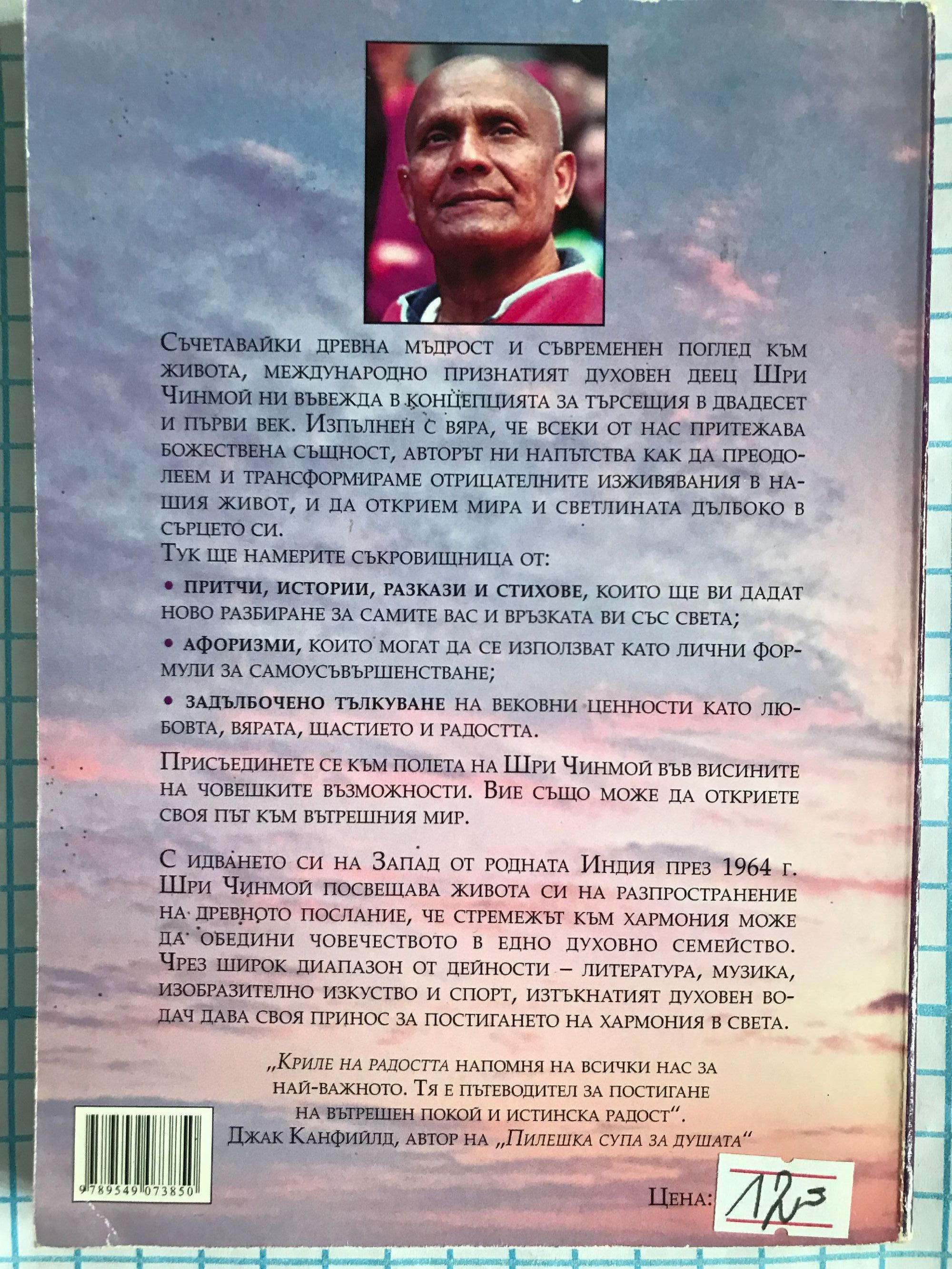Съчетавайки древна мъдрост и съвременен поглед към живота, международно признатият духовен деец Шри Чинмой ни въвежда в концепцията за търсещия в двадесет и първи век. Изпълнен с вяра, че всеки от нас притежава божествена същност, авторът ни напътства как да преодолеем и трансформираме отрицателните изживявания в нашия живот, и да открием мира и светлината дълбоко в себе си. Тук ще намерите съкровищница от: - Притчи, истории, разкази и стихове, които ще ви дадат ново разбиране за самите вас и връзката ви със света; - Афоризми, които могат да се използват като лични формули за самоусъвършенстване; - Задълбочено тълкуване на вековни ценности като любовта, вярата, щастието и радостта. Присъединете се към полета на Шри Чинмой във висините на човешките възможности. Вие също може да откриете своя път към вътрешния мир. С идването си на Запад от родната Индия през 1964г. Шри Чинмой посвещава живота си на разпространение на древното послание, че стремежът към хармония може да обедини човечеството в едно духовно семейство. Чрез широк диапазаон от дейности - литература, музика, изобразително изкуство и спорт, изтъкнатият духовен водач дава своя принос за постигането на хармония в света. ""Криле на радостта" напомня на всички нас за най-важното. Тя е пътеводител за постигане на вътрешен покой и истинска радост". Джак Канфийлд, автор на "Пилешка супа за душата"