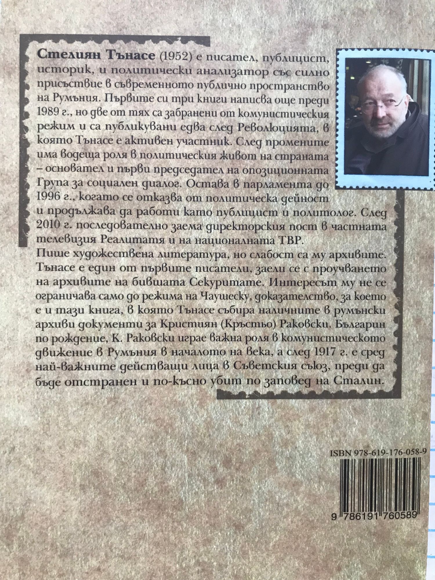 Стелиян Тънасе (1952) е писател, публицист, историк и политически анализатор със силно присъствие в съвременното публично пространствo на Румъния. Първите си три книги написва още преди 1989 г., но две от тях са забранени от комунистическия режим и са публикувани едва след Революцията, в която Тънасе е активен участник. След промените има водеща роля в политическия живот на страната » Oсновател и първи председател на опозиционната Група 3а социален диалог. Остава в парламента до 1996 г., когато се отказва от политическа дейност и продължава да работи като публицист и политолог. След 2010 г. последователно заема директорския пост в частната телевизия Реалитатя и на националната ТВР. Пише художествена литература, но слабост са му архивите. Тънасе е един от първите писатели, заели се с проучването на архивите на бившата Секуритате. Интересът му не се ограничава само до режима на Чаушеску, доказателство, 3а което е и тази книга, в която Тънасе събира наличните в румънски архиви документи 3а Кристиян (Кръстьо) Раковски. Българин по рождение, К. Раковски играе важна роля в комунистическото движение в Румъния в началото на века, а след 1917 г. е сред най-важните действащи лица в Съветския съюз, преди да бъде отстранен и по-късно убит по заповед на Сталин.