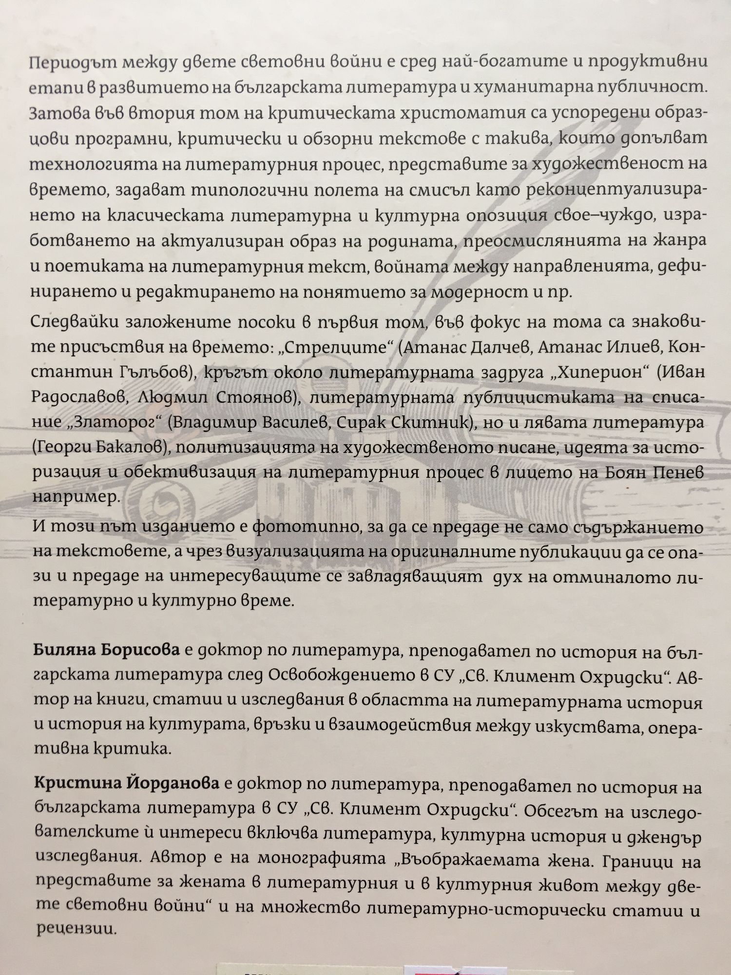 Периодът между двете световни войни е сред най-богатите и продуктивни етапи в развитието на българската литература и хуманитарна публичност. Затова във втория том на критическата христоматия са успоредени образцови програмни, критически и обзорни текстове с такива, които допълват технологията на литературния процес, представите за художественост на времето, задават типологични полета на смисъл като реконцептуализирането на класическата литературна и културна опозиция свое–чуждо, изработването на актуализиран образ на родината, преосмислянията на жанра и поетиката на литературния текст, войната между направленията, дефинирането и редактирането на понятието за модерност и пр. Следвайки заложените посоки в първия том, във фокус на тома са знаковите присъствия на времето: „Стрелците“ (Атанас Далчев, Атанас Илиев, Константин Гълъбов), кръгът около литературната задруга „Хиперион“ (Иван Радославов, Людмил Стоянов), литературната публицистиката на списание „Златорог“ (Владимир Василев, Сирак Скитник), но и лявата литература (Георги Бакалов), политизацията на художественото писане, идеята за историзация и обективизация на литературния процес в лицето на Боян Пенев например. И този път изданието е фототипно, за да се предаде не само съдържанието на текстовете, а чрез визуализацията на оригиналните публикации да се опази и предаде на интересуващите се завладяващият дух на отминалото литературно и културно време. Биляна Борисова е доктор по литература, преподавател по история на българската литература след Освобождението в СУ „Св. Климент Охридски“. Автор на книги, статии и изследвания в областта на литературната история и история на културата, връзки и взаимодействия между изкуствата, оперативна критика. Кристина Йорданова е доктор по литература, преподавател по история на българската литература в СУ „Св. Климент Охридски“. Обсегът на изследователските и интереси включва литература, културна история и джендър изследвания. Автор е на монографията „Въображаемата жена. Граници на представите за жената в литературния и в културния живот между двете световни войни“ и на множество литературно-исторически статии и рецензии.