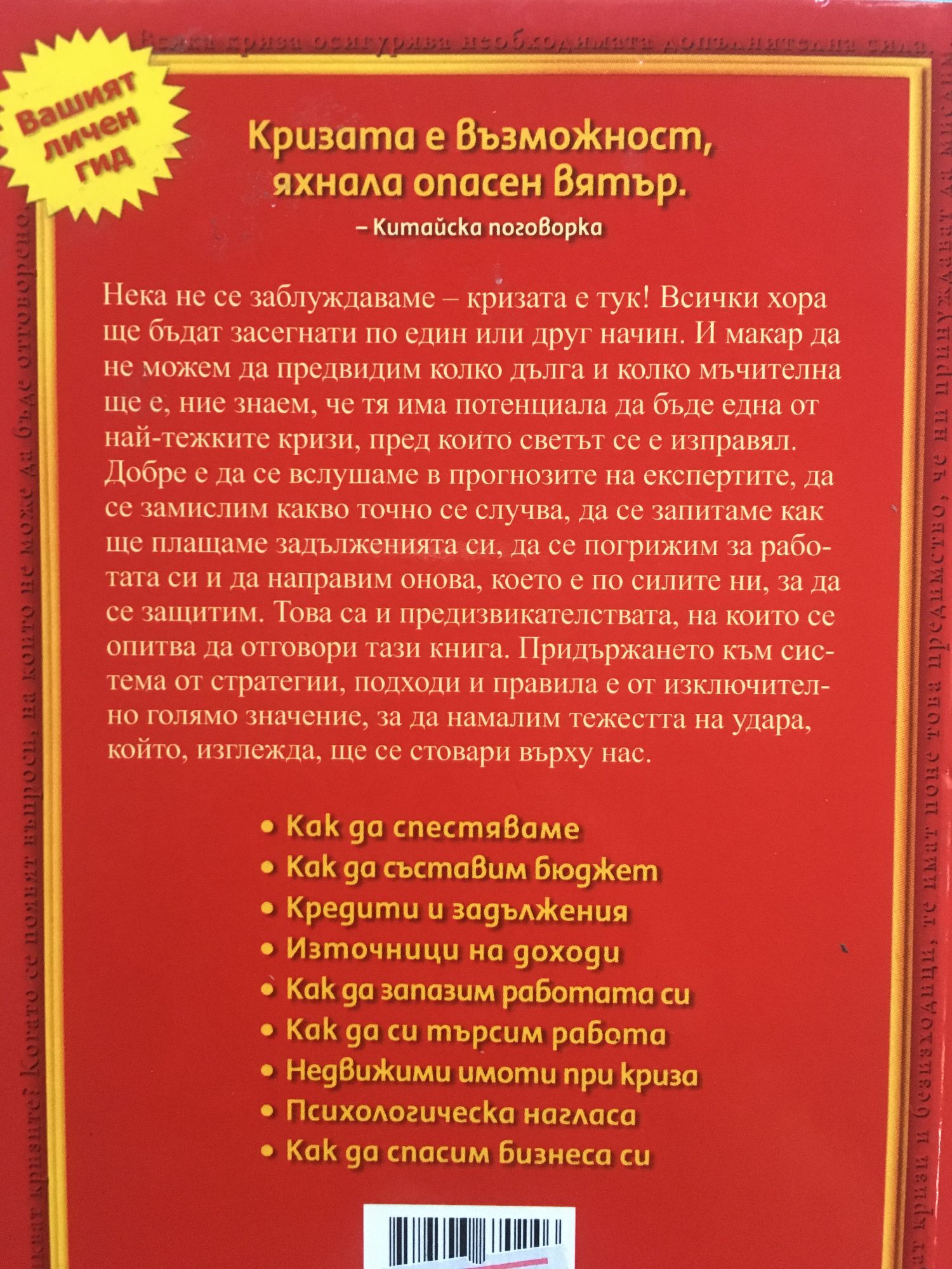 Кризата е възможност, яхнала опасен вятър. - китайска поговорка. Нека не се заблуждаваме - кризата е тук! Всички хора ще бъдат засегнати по един или друг начин. И макар да не можем да предвидим колко дълга и колко мъчителна ще е, ние знаем, че тя има потенциала да бъде една от най-тежките кризи, пред които светът се е изправял. Добре е да се вслушаме в прогнозите на експертите, да се замислим какво точно се случва, да се запитаме как ще плащаме задълженията си, да се погрижим за работата си и да направим онова, което е по силите ни, за да се защитим. Това са и предизвикателствата, на които се опитва да отговори тази книга. Придържането към система от стратегии, подходи и правила е от изключително голямо значение, за да намалим тежестта на удара, който, изглежда, ще се стовари върху нас. • Как да спестяваме • Как да съставим бюджет • Кредити и задължения • Източници на доходи • Как да запазим работата си • Как да си търсим работа • Недвижими имоти при криза • Психологическа нагласа • Как да спасим бизнеса си