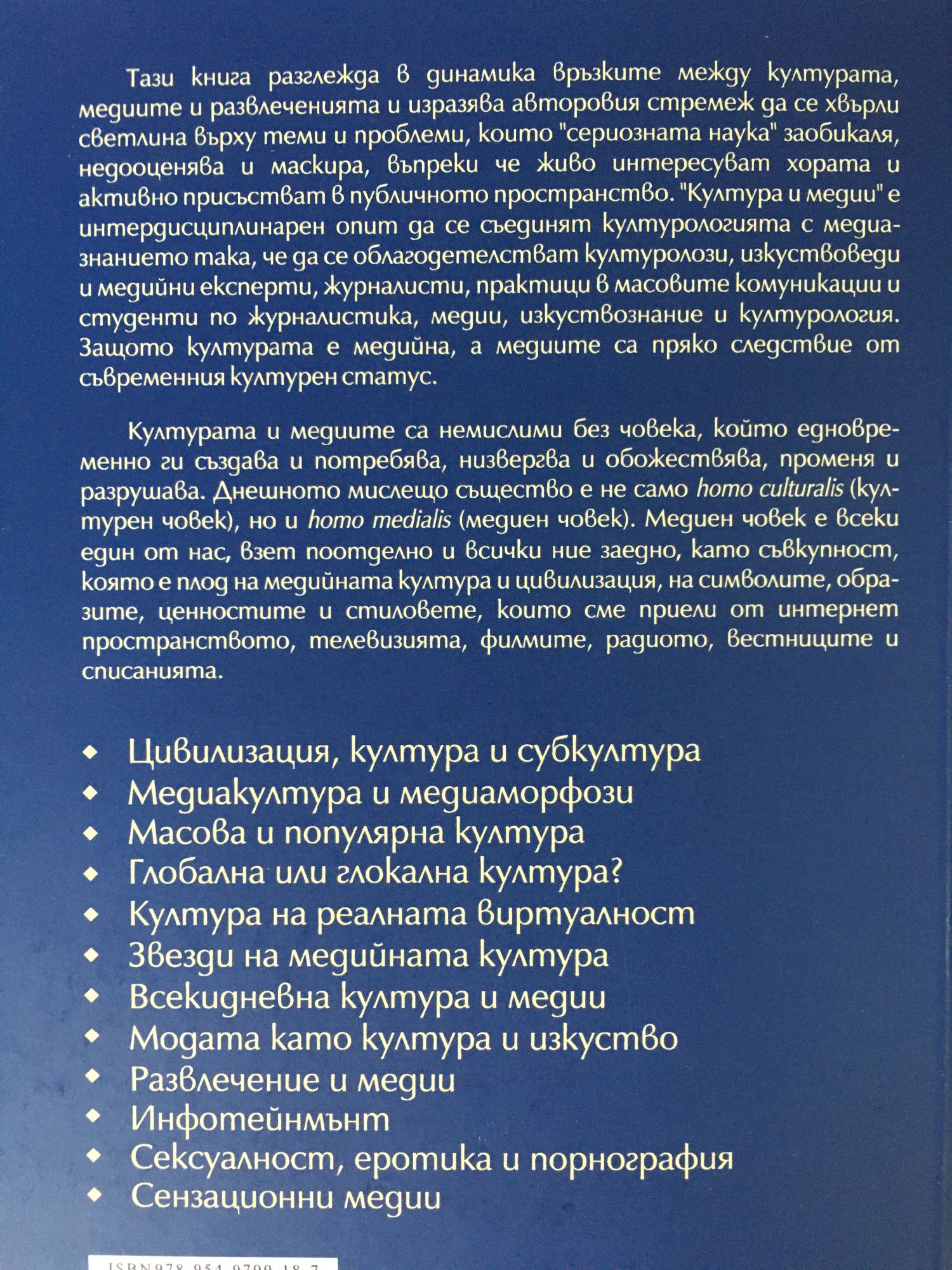 Тази книга разглежда в динамика връзките между културата, медиите и развлеченията и изразява авторовия стремеж да се хвърли светлина върху теми и проблеми, които "сериозната наука" заобикаля, недооценява и маскира, въпреки че живо интересуват хората и активно присьстват в публичното пространство. "Култура и медии" е интердисциплинарен опит да се съединят културологията с медиазнанието така, че да се облагодетелстват културолози, изкуствоведи и медийни експерти, журналисти, практици в масовите комуникации и студенти по журналистика, медии, изкуствознание и културология. Защото културата е медийна, а медиите са пряко следствие от съвременния културен статус. Културата и медиите са немислими без човека, който едновременно ги създава и потребява, низвергва и обожествява, променя и разрушава. Днешното мислещо същество е не само homo culturalis (културен човек), но и homo medialis (медиен човек). Медиен човек е всеки един от нас, взет поотделно и всички ние заедно, като съвкупност, която е плод на медийната култура и цивилизация, на символите, образите, ценностите и стиловете, които сме приели от интернет пространството, телевизията, филмите, радиото, вестниците и списанията. Цивилизация, култура и субкултура Медиакултура и медиаморфози Масова и популярна култура Глобална или глокална култура? Култура на реалната виртуалност Звезди на медийната култура Всекидневна култура и медии Модата като култура и изкуство Развлечение и медии Инфотейнмънт Сексуалност, еротика и порнография Сензационни медии