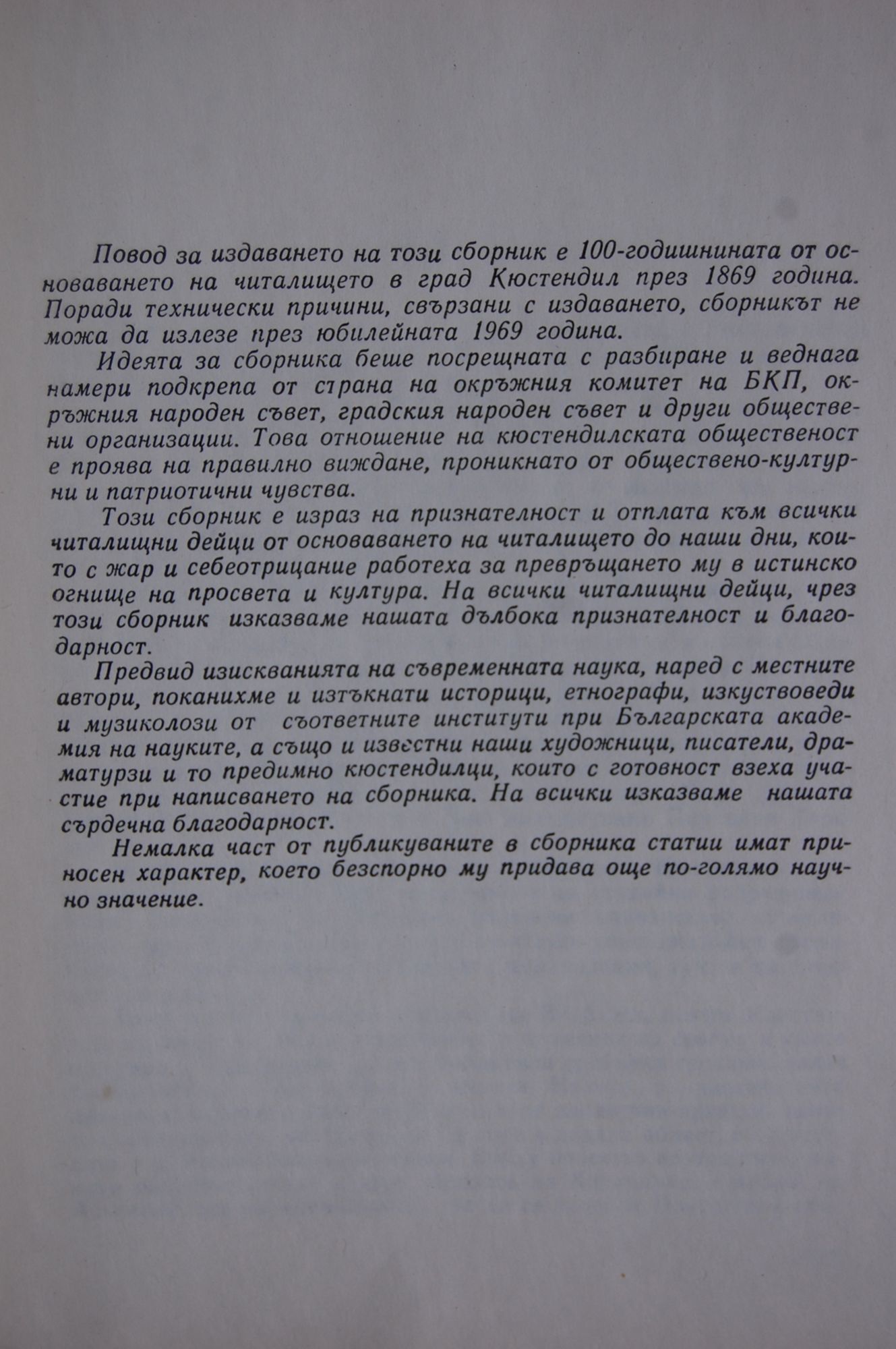 Един град и един край, като Кюстендилския, с многовековен живот, с драматични превратности и с героични устреми към свобода и правда, има какво да покаже на народа си. Кюстендил никога не е бил мъртъв град - без душа, без деятелни духовни дирения и тревоги. За него и за неговите обитатели е писано още в класическата древност.