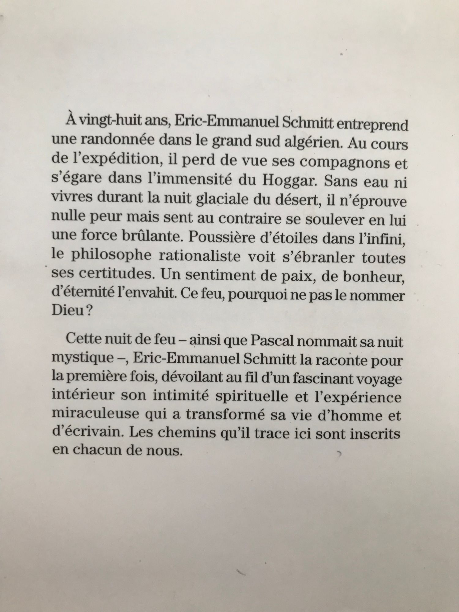 À vingt-huit ans, Eric-Emmanuel Schmitt entreprend une randonnée dans legrand sud algérien. Au cours de l’expédition, il perd de vue ses compagnons ets’égare dans l’immensité du Hoggar. Sans eau ni vivres durant la nuit glaciale dudésert, il n’éprouve nulle peur mais sent au contraire se soulever en lui une forcebrûlante. Poussière d’étoiles dans l’infini, le philosophe rationaliste voit s’ébranlertoutes ses certitudes. Un sentiment de paix, de bonheur, d’éternité l’envahit.Ce feu, pourquoi ne pas le nommer Dieu ?Cette nuit de feu – ainsi que Pascal nommait sa nuit mystique –, Eric-EmmanuelSchmitt la raconte pour la première fois, dévoilant au fil d’un fascinant voyageintérieur son intimité spirituelle et l’expérience miraculeuse qui a transformésa vie d’homme et d’écrivain. Les chemins qu’il trace ici sont inscrits en chacunde nous.