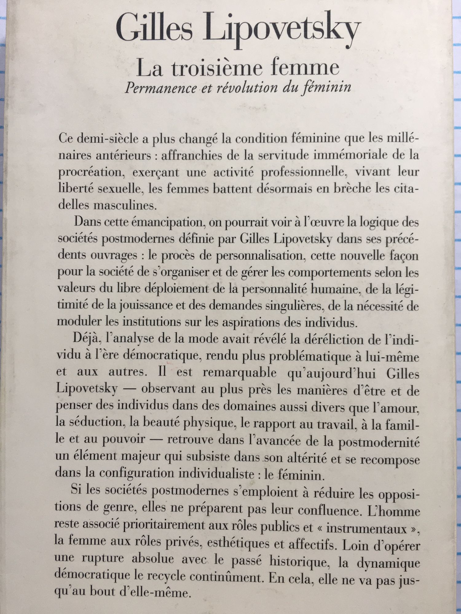 Ce demi-siècle a plus changé la condition féminine que les millénaires antérieurs : affranchies de la servitude immémoriale de la procréation, exerçant une activité professionnelle, vivant leur liberté sexuelle, les femmes battent désormais en brèche les citadelles masculines. Dans cette émancipation, on pourrait voir à l'oeuvre la logique des sociétés postmodernes définie par Gilles Lipovetsky dans ses précédents ouvrages : le procès de personnalisation, cette nouvelle façon pour la société de gérer les comportements selon les valeurs du libre déploiement de la personnalité humaine, de la légimité de la jouissance et des demandes singulières, de la nécessité de moduler les institutions sur les aspirations des individus. Il est remarquable qu'aujourd'hui Gilles Lipovetsky - observant au plus près les manières d'être et de penser des individus dans des domaines aussi divers que l'amour, la séduction, la beauté physique, le rapport au travail, à la famille et au pouvoir - retrouve dans l'avancée de la postmodernité un élément majeur qui subsiste dans son altérité et se recompose dans la configuration individualiste : le féminin. Si les sociétés postmodernes s'emploient à réduire les oppositions de genre, elles ne préparent pas leur confluence. L'homme reste associé prioritairement aux rôles publics et "instrumentaux", la femme aux rôles privés, esthétiques et affectifs. Loin d'opérer une rupture absolue avec le passé historique, la dynamique démocratique le recycle continûment. En cela, elle ne va pas jusqu'au bout d'elle-même.