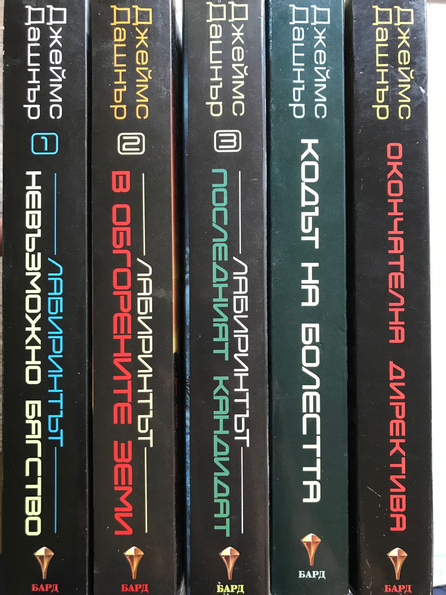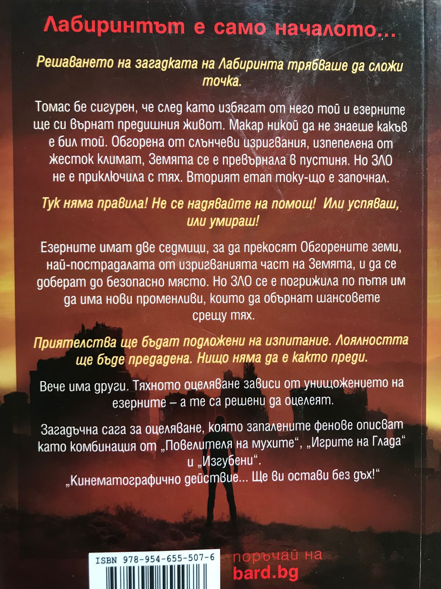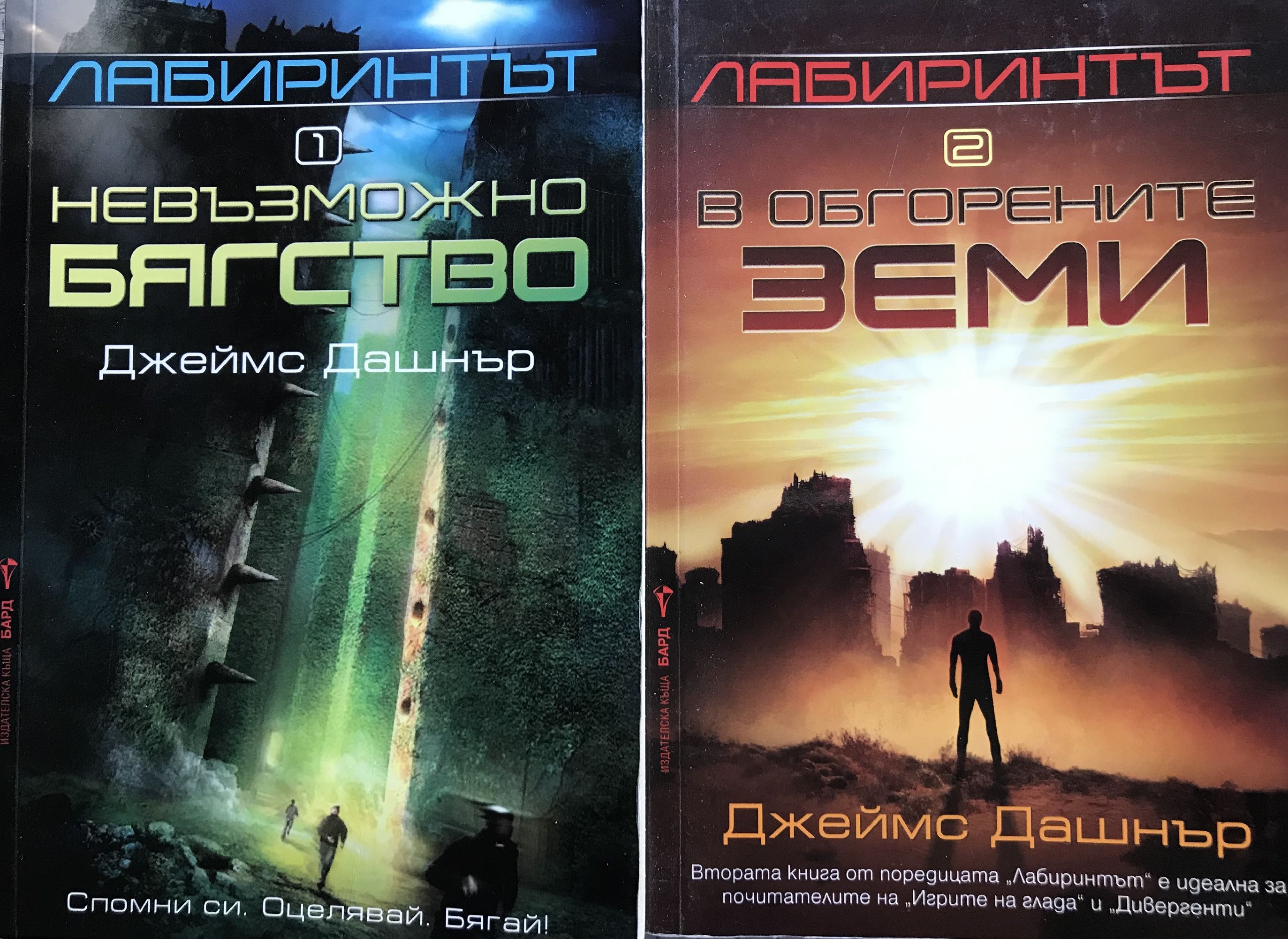 Книга 1: Футуристичен роман антиутопия, първа книга от нашумялата трилогия на Джеймс Дашнър “Лабиринтът” - бестселър на “Ню Йорк Таймс”, смятан за съвременна класика, по който е сниман едноименният филм. Ако не те е страх, значи не си човек. Когато Томас се събужда в асансьора, си спомня само името си. Заобиколен е от непознати момчета, които също са изгубили паметта си. Добре дошъл в Езерото. Зад високите каменни стени, заобикалящи Езерото, се простира безкраен, постоянно променящ се лабиринт. Това е единственият изход, но никой не е преминавал през него жив. Всичко ще се промени. Тогава се появява едно момиче. Първото момиче на света. И носи ужасяващо послание. Спомни си. Оцелявай. Бягай! “Чудесен екшън - високоскоростен, и все пак изпълнен с размисли и наблюдения.” Нюздей “Държи читателя на нокти до последния момент.” Киркъс ревюс “Тотално завладяващо четиво!” Буклист Книга 2: Лабиринтът е само началото... Решаването на загадката на Лабиринта трябваше да сложи точка. Томас бе сигурен, че след като избягат от него той и езерните ще си върнат предишния живот. Макар никой да не знаеше какъв е бил той. Обгорена от слънчеви изригвания, изпепелена от жесток климат, Земята се е превърнала в пустиня. Но ЗЛО не е приключила с тях. Вторият етап току-що е започнал. Тук няма правила! Не се надявайте на помощ! Или успяваш, или умираш! Езерните имат две седмици, за да прекосят Обгорените земи, най-пострадалата от изригванията част на Земята, и да се доберат до безопасно място. Но ЗЛО се е погрижила по пътя им да има нови променливи, които да обърнат шансовете срещу тях. Приятелства ще бъдат подложени на изпитание. Лоялността ще бъде предадена. Нищо няма да е както преди. Вече има други. Тяхното оцеляване зависи от унищожението на езерните – а те са решени да оцелеят. Загадъчна сага за оцеляване, която запалените фенове описват като комбинация от „Повелителя на мухите“, „Игрите на Глада“ и „Изгубени“. „Кинематографично действие... Ще ви остави без дъх!“ Книга 3: Сам си! Наближава краят! Не им вярвай! ЗЛО е отнела на Томас всичко: живота му, спомените, а сега и единствените му приятели – езерните. Но най-сетне краят е близо. Изпитанията приключват след един последен тест. Дали обаче някой ще оцелее? Това, което ЗЛО не знае, е, че Томас си спомня далеч повече, отколкото смята. И то е достатъчно, за да не повярва на нито една тяхна дума. Ала истината ще бъде ужасяваща. Томас е победил Лабиринта. Оцелял е в Обгорените земи. Рискувал е всичко, за да спаси приятелите си. И тъкмо истината може да е тази, която ще сложи край на всичко това. Времето за лъжи е отминало. Книга 4: В тази история, предхождаща събитията от „Лабиринтът – Невъзможно бягство“, се съдържат всички важни отговори. Как ЗЛО събра езерните? Кои са група Б? И на чия страна са в действителност Томас и Тереза? Ще бъдат разобличени лъжи. Ще бъдат разкрити тайни. Ще се разбере кой кому е верен. И никой няма да предположи какво иде накрая. Защото преди да го има лабиринта, е имало „Кодът на болестта“. Някога дойде краят на света. Горите изгоряха, езерата и реките пресъхнаха, океаните се смалиха. Сетне дойде чумата, ужасна болест пламна по целия свят. Измираха цели семейства, навсякъде се възцари насилие, хора убиваха хора. След това се появиха хората от ЗЛО, които търсеха някакъв отговор. А после те намериха идеалнот