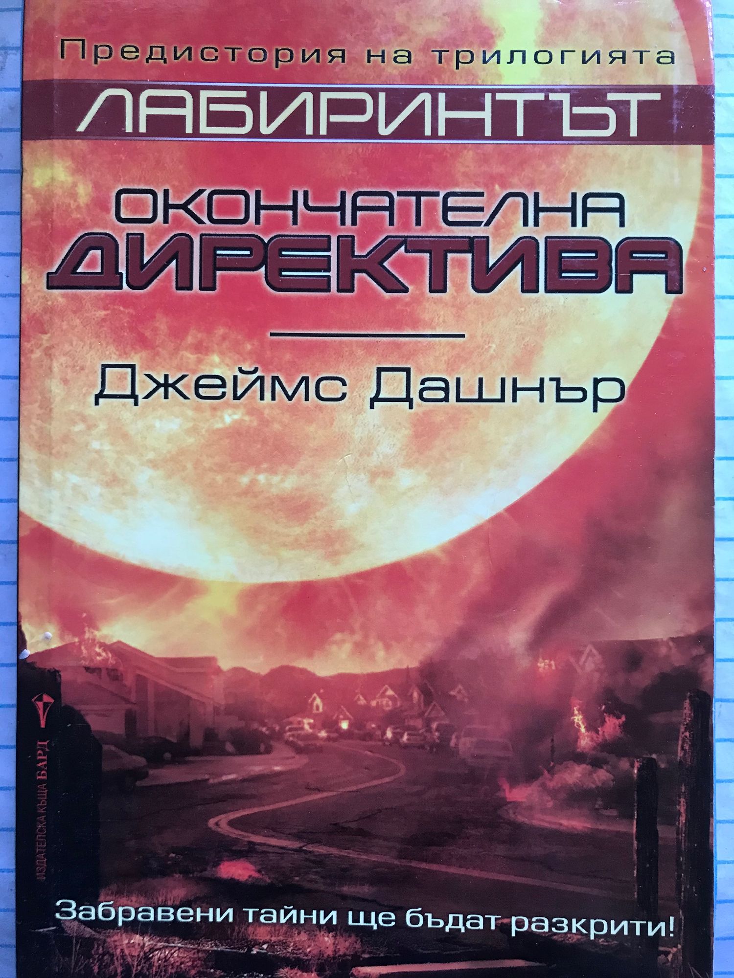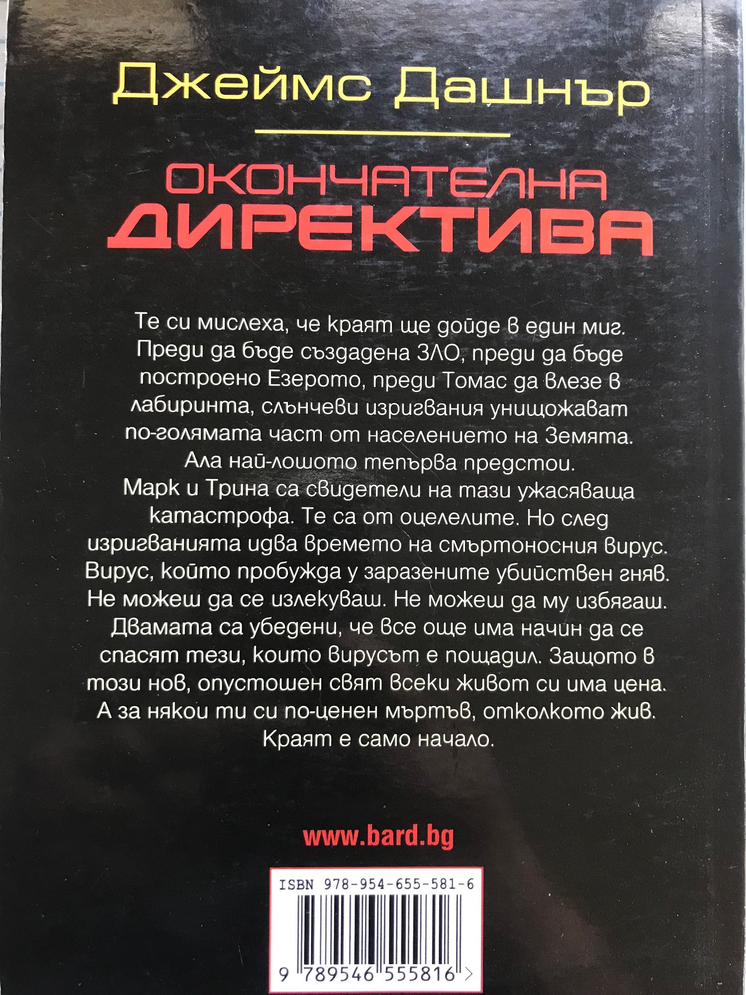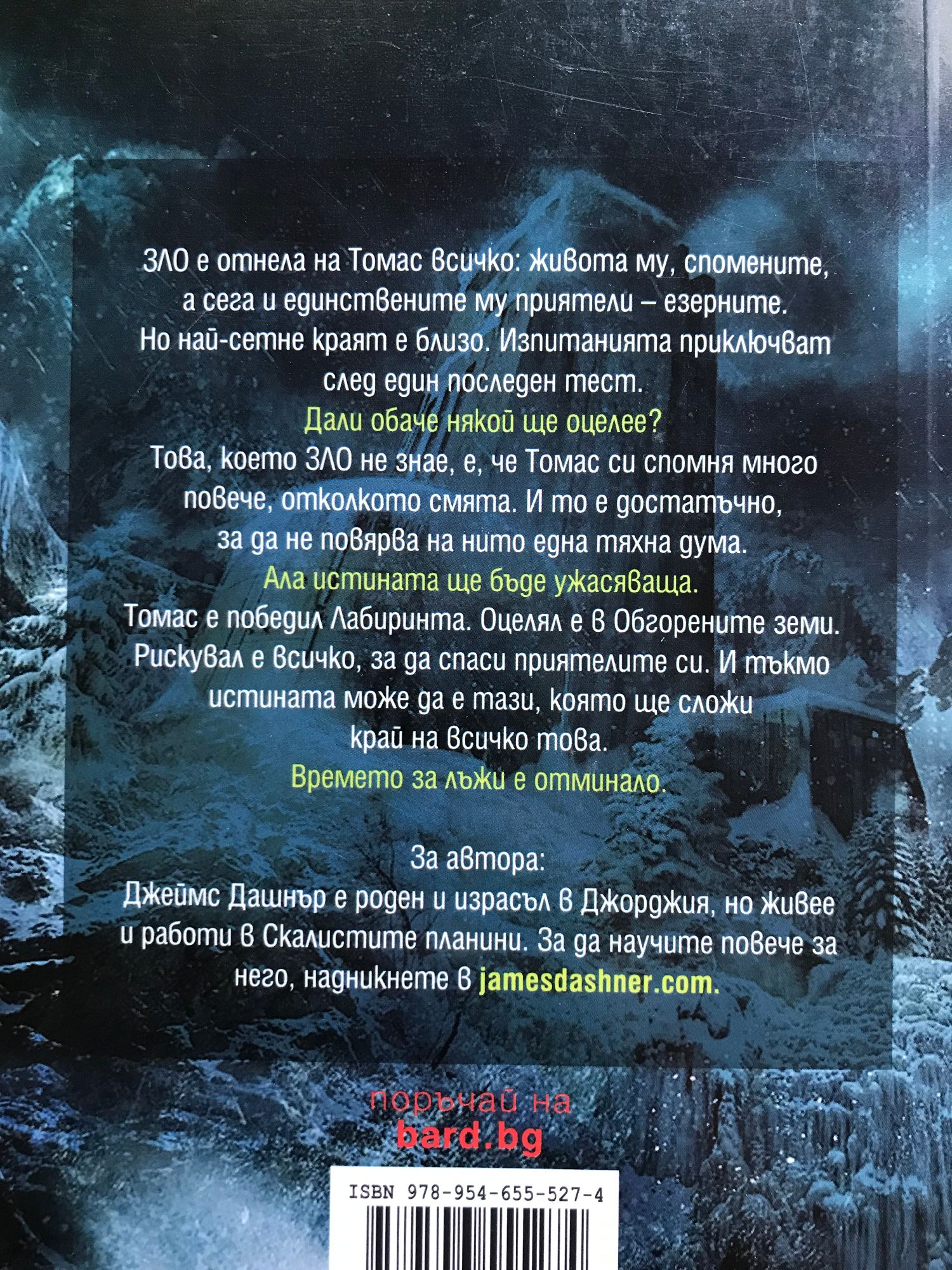 Книга 1: Футуристичен роман антиутопия, първа книга от нашумялата трилогия на Джеймс Дашнър “Лабиринтът” - бестселър на “Ню Йорк Таймс”, смятан за съвременна класика, по който е сниман едноименният филм. Ако не те е страх, значи не си човек. Когато Томас се събужда в асансьора, си спомня само името си. Заобиколен е от непознати момчета, които също са изгубили паметта си. Добре дошъл в Езерото. Зад високите каменни стени, заобикалящи Езерото, се простира безкраен, постоянно променящ се лабиринт. Това е единственият изход, но никой не е преминавал през него жив. Всичко ще се промени. Тогава се появява едно момиче. Първото момиче на света. И носи ужасяващо послание. Спомни си. Оцелявай. Бягай! “Чудесен екшън - високоскоростен, и все пак изпълнен с размисли и наблюдения.” Нюздей “Държи читателя на нокти до последния момент.” Киркъс ревюс “Тотално завладяващо четиво!” Буклист Книга 2: Лабиринтът е само началото... Решаването на загадката на Лабиринта трябваше да сложи точка. Томас бе сигурен, че след като избягат от него той и езерните ще си върнат предишния живот. Макар никой да не знаеше какъв е бил той. Обгорена от слънчеви изригвания, изпепелена от жесток климат, Земята се е превърнала в пустиня. Но ЗЛО не е приключила с тях. Вторият етап току-що е започнал. Тук няма правила! Не се надявайте на помощ! Или успяваш, или умираш! Езерните имат две седмици, за да прекосят Обгорените земи, най-пострадалата от изригванията част на Земята, и да се доберат до безопасно място. Но ЗЛО се е погрижила по пътя им да има нови променливи, които да обърнат шансовете срещу тях. Приятелства ще бъдат подложени на изпитание. Лоялността ще бъде предадена. Нищо няма да е както преди. Вече има други. Тяхното оцеляване зависи от унищожението на езерните – а те са решени да оцелеят. Загадъчна сага за оцеляване, която запалените фенове описват като комбинация от „Повелителя на мухите“, „Игрите на Глада“ и „Изгубени“. „Кинематографично действие... Ще ви остави без дъх!“ Книга 3: Сам си! Наближава краят! Не им вярвай! ЗЛО е отнела на Томас всичко: живота му, спомените, а сега и единствените му приятели – езерните. Но най-сетне краят е близо. Изпитанията приключват след един последен тест. Дали обаче някой ще оцелее? Това, което ЗЛО не знае, е, че Томас си спомня далеч повече, отколкото смята. И то е достатъчно, за да не повярва на нито една тяхна дума. Ала истината ще бъде ужасяваща. Томас е победил Лабиринта. Оцелял е в Обгорените земи. Рискувал е всичко, за да спаси приятелите си. И тъкмо истината може да е тази, която ще сложи край на всичко това. Времето за лъжи е отминало. Книга 4: В тази история, предхождаща събитията от „Лабиринтът – Невъзможно бягство“, се съдържат всички важни отговори. Как ЗЛО събра езерните? Кои са група Б? И на чия страна са в действителност Томас и Тереза? Ще бъдат разобличени лъжи. Ще бъдат разкрити тайни. Ще се разбере кой кому е верен. И никой няма да предположи какво иде накрая. Защото преди да го има лабиринта, е имало „Кодът на болестта“. Някога дойде краят на света. Горите изгоряха, езерата и реките пресъхнаха, океаните се смалиха. Сетне дойде чумата, ужасна болест пламна по целия свят. Измираха цели семейства, навсякъде се възцари насилие, хора убиваха хора. След това се появиха хората от ЗЛО, които търсеха някакъв отговор. А после те намериха идеалнот