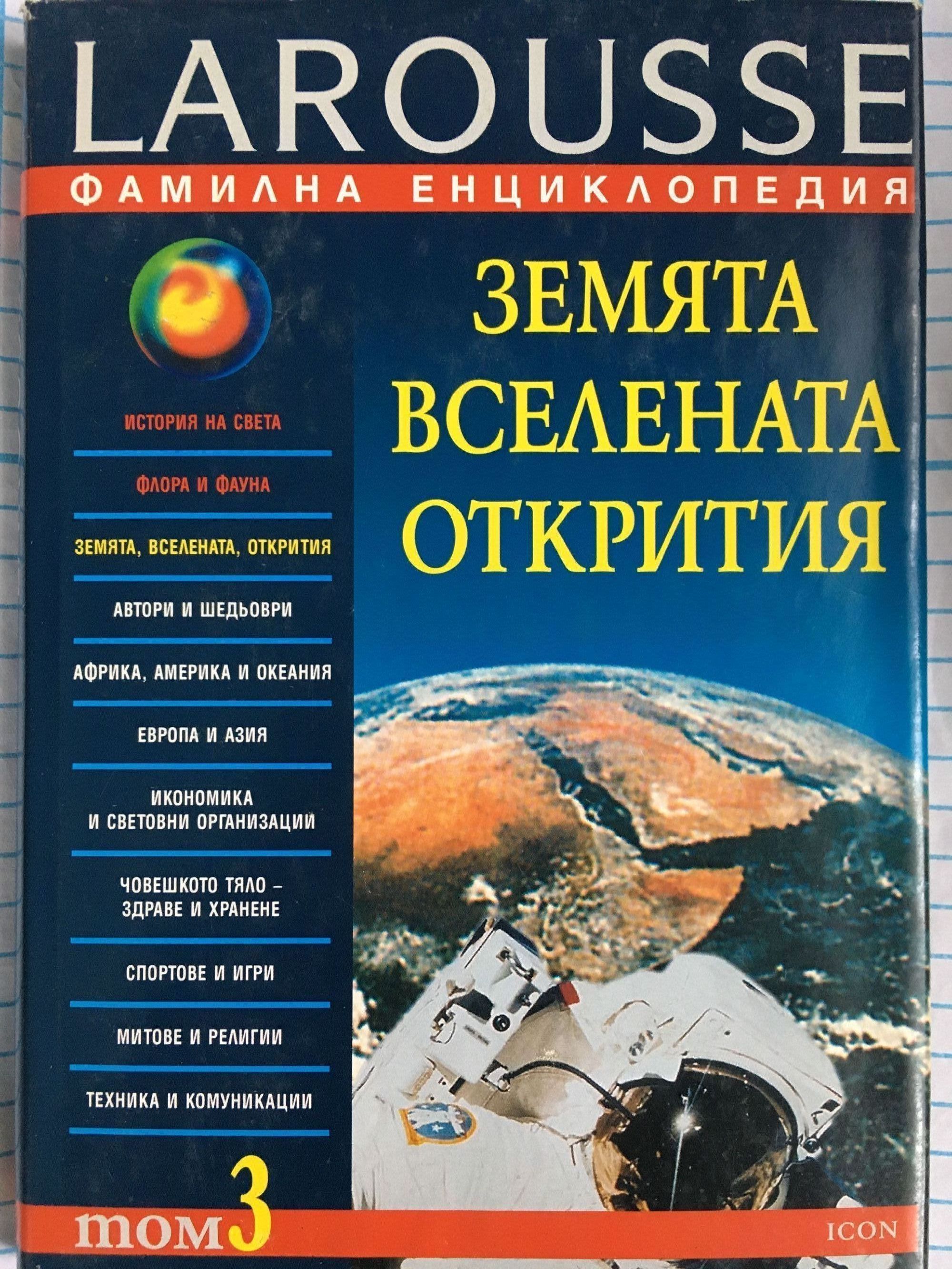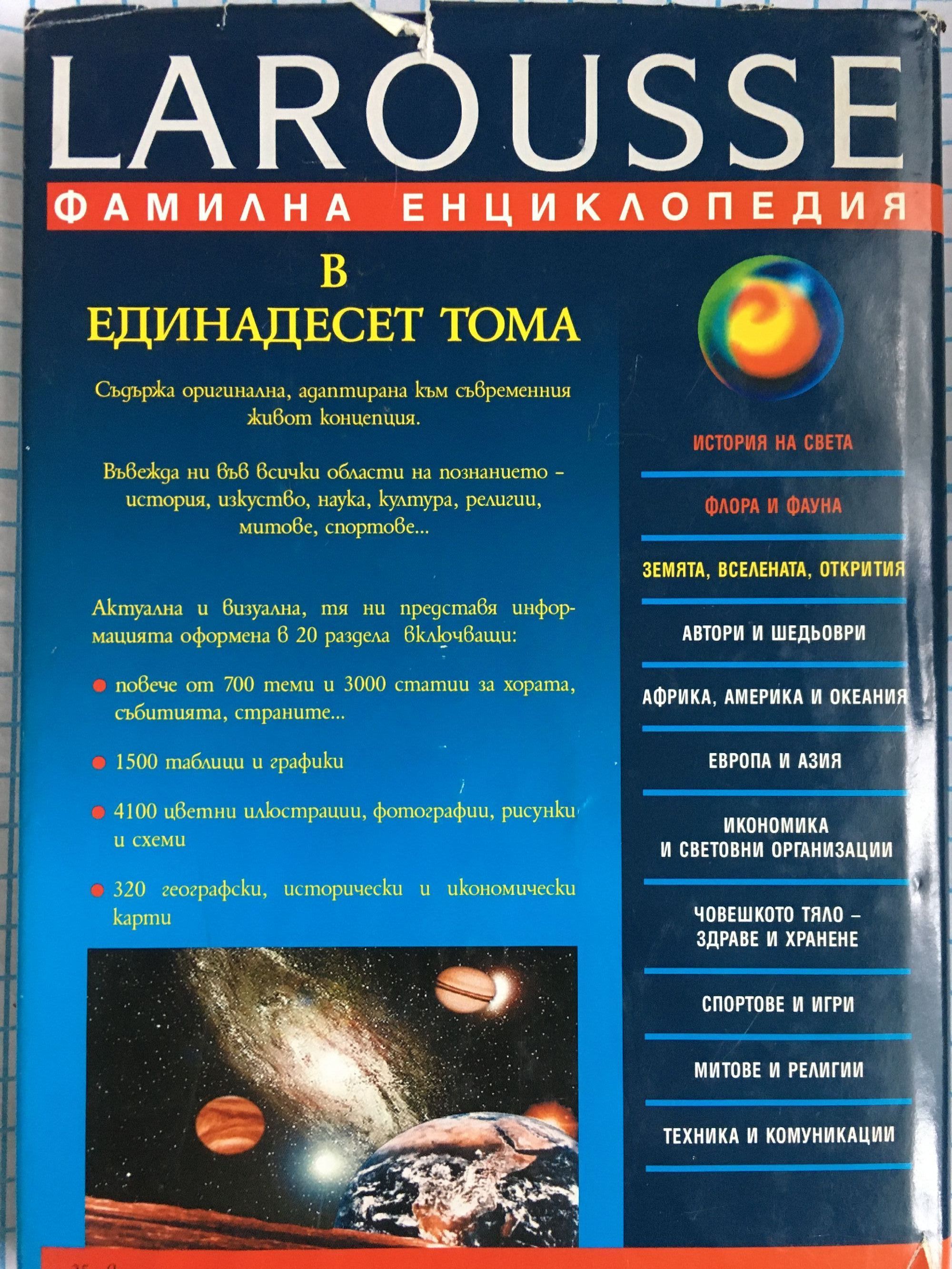 Тази тема на фамилната енциклопедия представя в синтезиран вид основните съвременни знания в областта на науките, изучаващи Вселената и Земята. След въведение за характера на материята и средствата, с които човечеството проучва нейната неизчерпаемост, се прави обстоен преглед на основните астрономически обекти - от най-близките до най-далечните. Втората част ни представя Земята, нейната структура и история, естествените явления, свързани с развитието й, както и специфични явления от повърхността и атмосферата й.