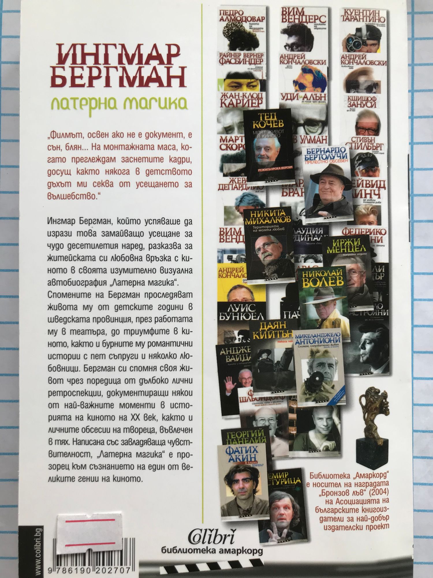 „Филмът, освен ако не е документ, е сън, блян... На монтажната маса, когато преглеждам заснетите кадри, досущ както някога в детството дъхът ми секва от усещането за вълшебство.“ Ингмар Бергман, който успяваше да изрази това замайващо усещане за чудо десетилетия наред, разказва за житейската си любовна връзка с киното в своята изумително визуална автобиография „Латерна магика“. Спомените на Бергман проследяват живота му от детските години в шведската провинция, през работата му в театъра, до триумфите в киното, както и бурните му романтични истории с пет съпруги и няколко любовници. Бергман си спомня своя живот чрез поредица от дълбоко лични ретроспекции, документиращи някои от най-важните моменти в историята на киното на XX век, както и личните обсесии на твореца, въвлечен в тях. Написана със завладяваща чувствителност, „Латерна магика“ е прозорец към съзнанието на един от великите гении на киното.