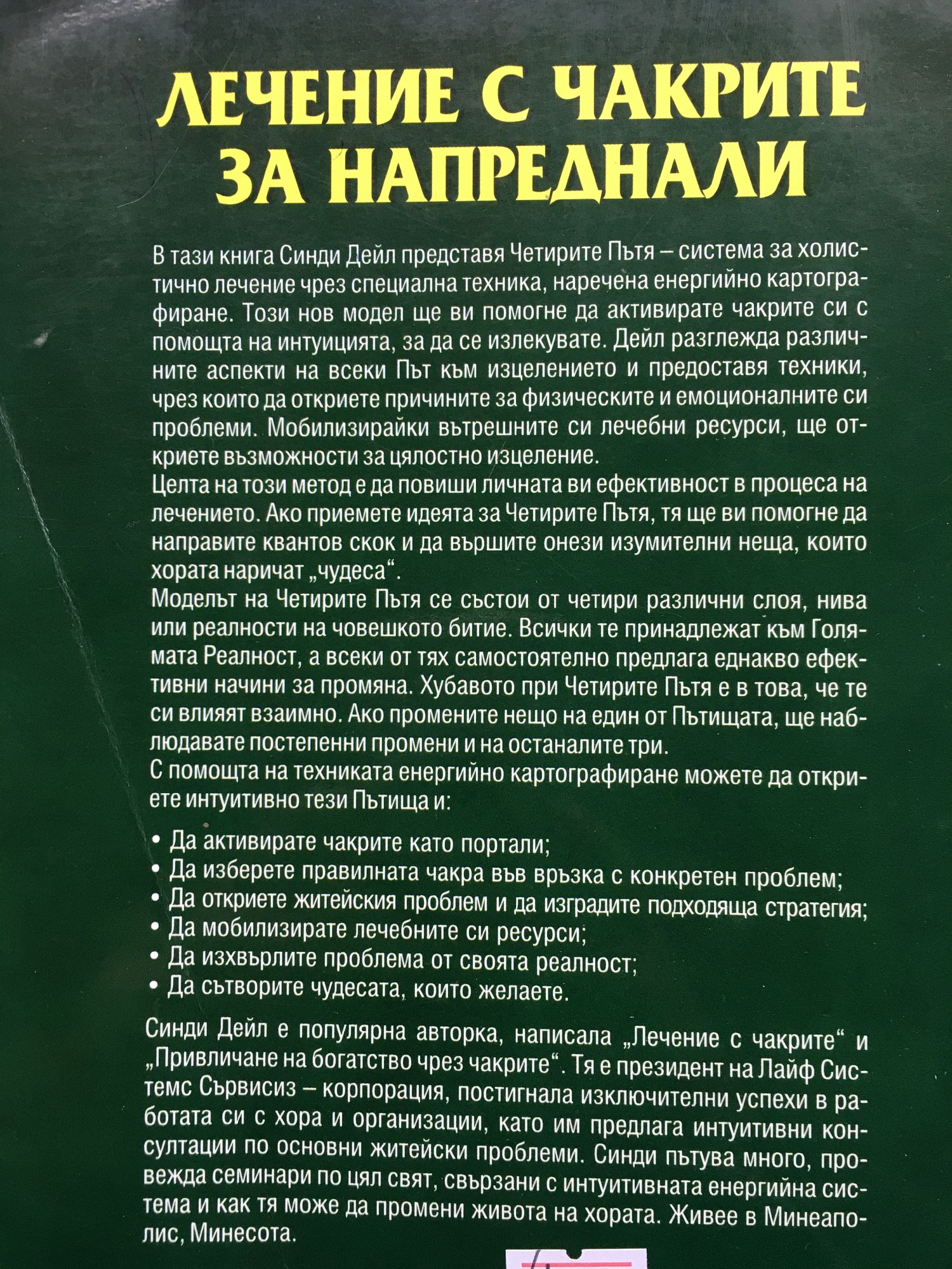 В тази книга Синди Дейл представя Четирите Пътя - система за холистично лечение чрез специална техника, наречена енергийно картографиране. Този нов модел ще ви помогне да активирате чакрите си с помощта на интуицията, за да се излекувате. Дейл разглежда различните аспекти на всеки Път към изцелението и предоставя техники, чрез които да откриете причините за физическите и емоционалните си проблеми. Мобилизирайки вътрешните си лечебни ресурси, ще откриете възможности за цялостно изцеление. Целта на този метод е да повиши личната ви ефективност в процеса на лечението. Ако приемете идеята за Четирите Пътя, тя ще ви помогне да направите квантов скок и да вършите онези изумителни неща, които хората наричат „чудеса". Моделът на Четирите Пътя се състои от четири различни слоя, нива или реалности на човешкото битие. Всички те принадлежат към Голямата Реалност, а всеки от тях самостоятелно предлага еднакво ефективни начини за промяна. Хубавото при Четирите Пътя е в това, че те си влияят взаимно. Ако промените нещо на един от Пътищата, ще наблюдавате постепенни промени и на останалите три. С помощта на техниката енергийно картографиране можете да откриете интуитивно тези Пътища и: • Да активирате чакрите като портали; • Да изберете правилната чакра във връзка с конкретен проблем; • Да откриете житейския проблем и да изградите подходяща стратегия; • Да мобилизирате лечебните си ресурси; • Да изхвърлите проблема от своята реалност; • Да сътворите чудесата, които желаете. Синди Дейл е популярна авторка, написала „Лечение с чакрите" и „Привличане на богатство чрез чакрите". Тя е президент на Лайф Системс Сървисиз - корпорация, постигнала изключителни успехи в работата си с хора и организации, като им предлага интуитивни консултации по основни житейски проблеми. Синди пътува много, провежда семинари по цял свят, свързани с интуитивната енергийна система и как тя може да промени живота на хората. Живее в Минеаполис, Минесота.