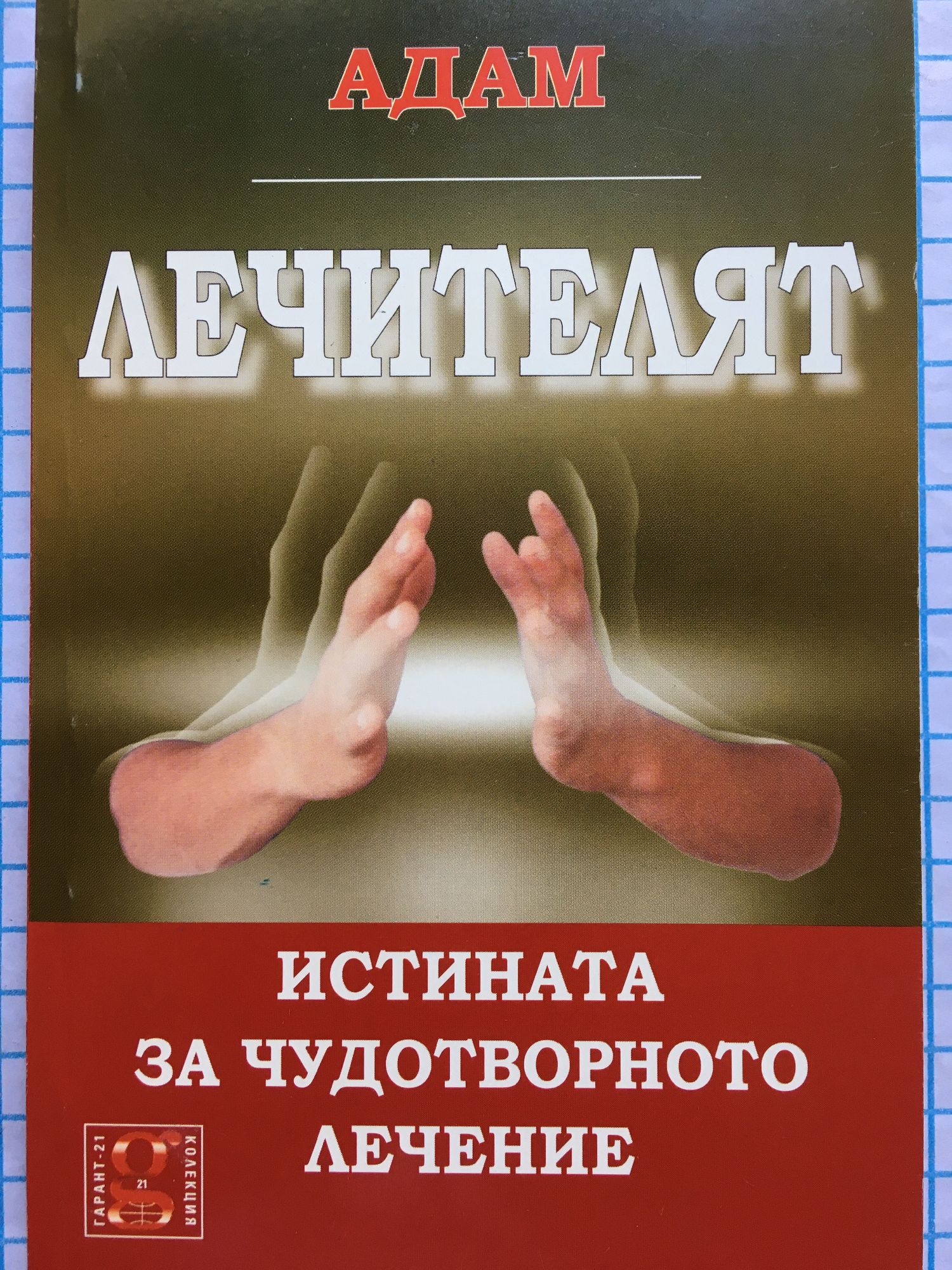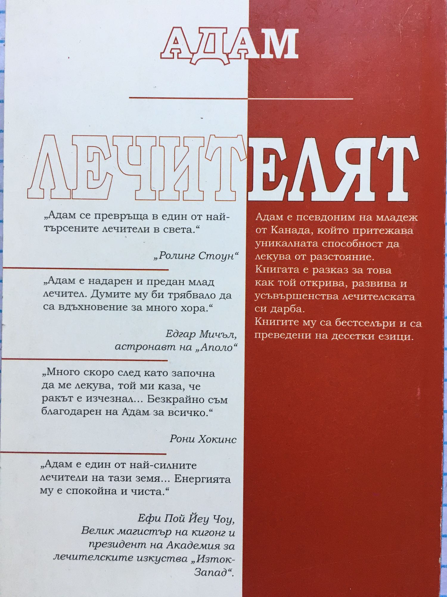 Адам е псевдоним на младеж от Канада, който притежава уникалната способност да лекува от разстояние. Книгата е разказ за това как той открива, развива и усъвършенства лечителската си дарба. Книгите му са бестселъри и са преведени на десетки езици. "Много скоро след като започна да ме лекува, той ми каза, че ракът е изчезнал... Безкрайно съм благодарен на Адам за всичко." Рони Хокинс "Адам е един от най-силните лечители на тази земя... Енергията му е спокойна и чиста." Ефи Пой Йеу Чоу, Велик магистър на кигонг и президент на Академията за лечителски изкуства "Изток-Запад"