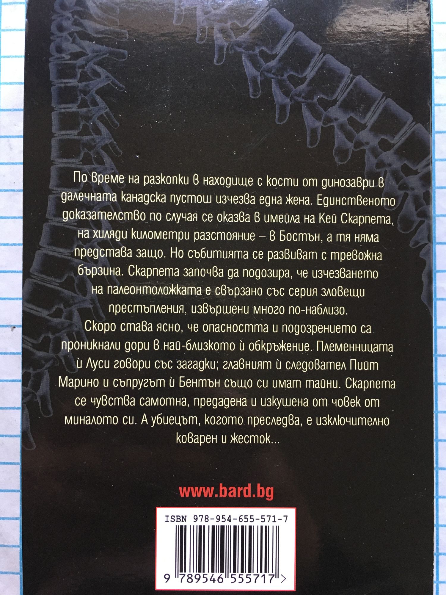 Корнуел е знаков автор за жанра, а романът е от звездна величина! Ню Йорк Таймс По време на разкопки в находище с кости от динозаври в далечната канадска пустош изчезва една жена. Единственото доказателство по случая се оказва в имейла на Кей Скарпета, на хиляди километри разстояние – в Бостън, а тя няма представа защо. Но събитията се развиват с тревожна бързина. Скарпета започва да подозира, че изчезването на палеонтоложката е свързано със серия зловещи престъпления, извършени много по-наблизо. Скоро става ясно, че опасността и подозрението са проникнали дори в най-близкото й обкръжение. Племенницата й Луси говори със загадки; главният й следовател Пийт Марино и съпругът й Бентън също си имат тайни. Скарпета се чувства самотна, предадена и изкушена от човек от миналото си. А убиецът, когото преследва, е изключително коварен и жесток...