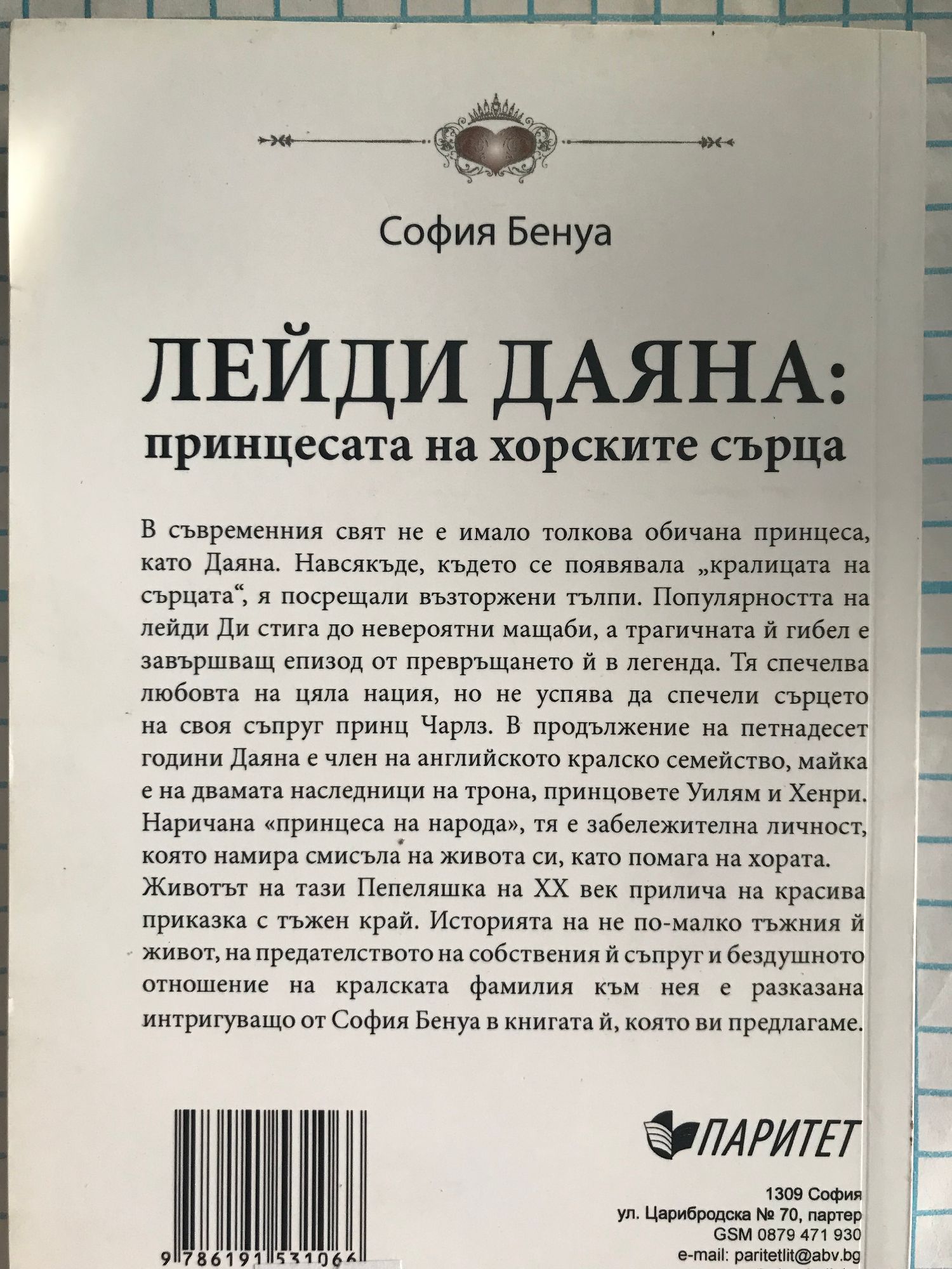 В съвременния свят не е имало толкова обичана принцеса като Даяна. Навсякъде, където се появявала "кралицата на сърцата", я посрещали възторжени тълпи. Популярността на лейди Ди стига до невероятни мащаби, а трагичната ѝ гибел е завършващ епизод от превръщането ѝ в легенда. Тя спечелва любовта на цяла нация, но не успява да спечели сърцето на своя съпруг принц Чарлз. В продължение на петнадесет години Даяна е член на английското кралско семейство, майка е на двамата наследници на трона, принцовете Уилям и Хенри. Наричана "принцеса на народа", тя е забележителна личност, която намира смисъла на живота си, като помага на хората. Животът на тази Пепеляшка на ХХ век прилича на красива приказка с тъжен край. Историята на не по-малко тъжния ѝ живот, на предателството на собствения ѝ съпруг и бездушното отношение на кралската фамилия към нея е разказана интригуващо от София Бенуа в книгата ѝ - "Лейди Даяна: Принцесата на хорските сърца".