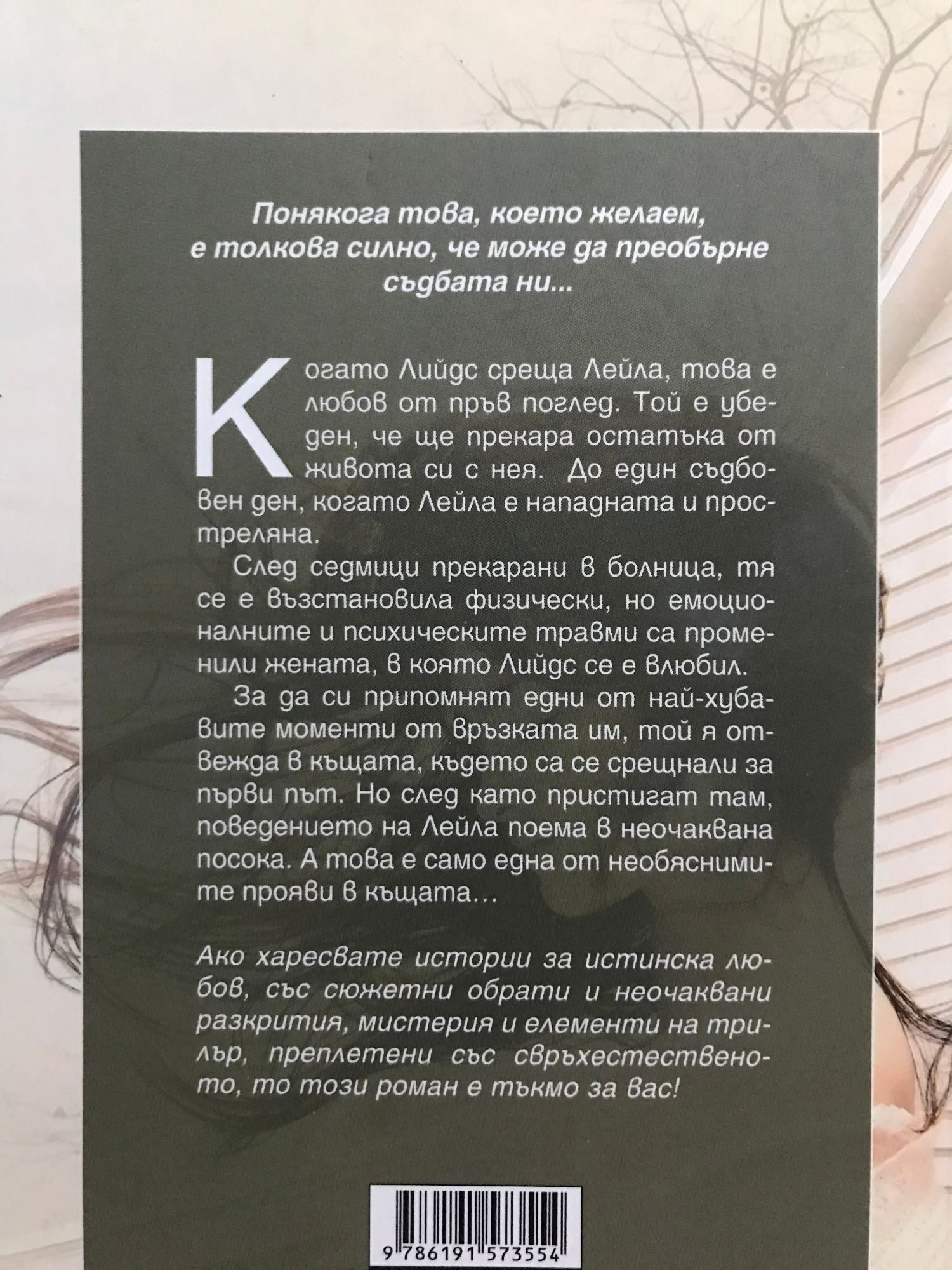 Понякога това, което желаем, е толкова силно, че може да преобърне съдбата ни... Когато Лийдс среща Лейла, това е любов от пръв поглед. Той е убеден, че ще прекара остатъка от живота си с нея. До един съдбовен ден, когато Лейла е нападната и простреляна. След седмици прекарани в болница, тя се е възстановила физически, но емоционалните и психическите травми са променили жената, в която Лийдс се е влюбил. За да си припомнят едни от най-хубавите моменти от връзката им, той я отвежда в къщата, където са се срещнали за първи път. Но след като пристигат там, поведението на Лейла поема в неочаквана посока. А това е само една от необяснимите прояви в къщата… Ако харесвате истории за истинска любов, със сюжетни обрати и неочаквани разкрития, мистерия и елементи на трилър, преплетени със свръхестественото, то този роман е тъкмо за вас!