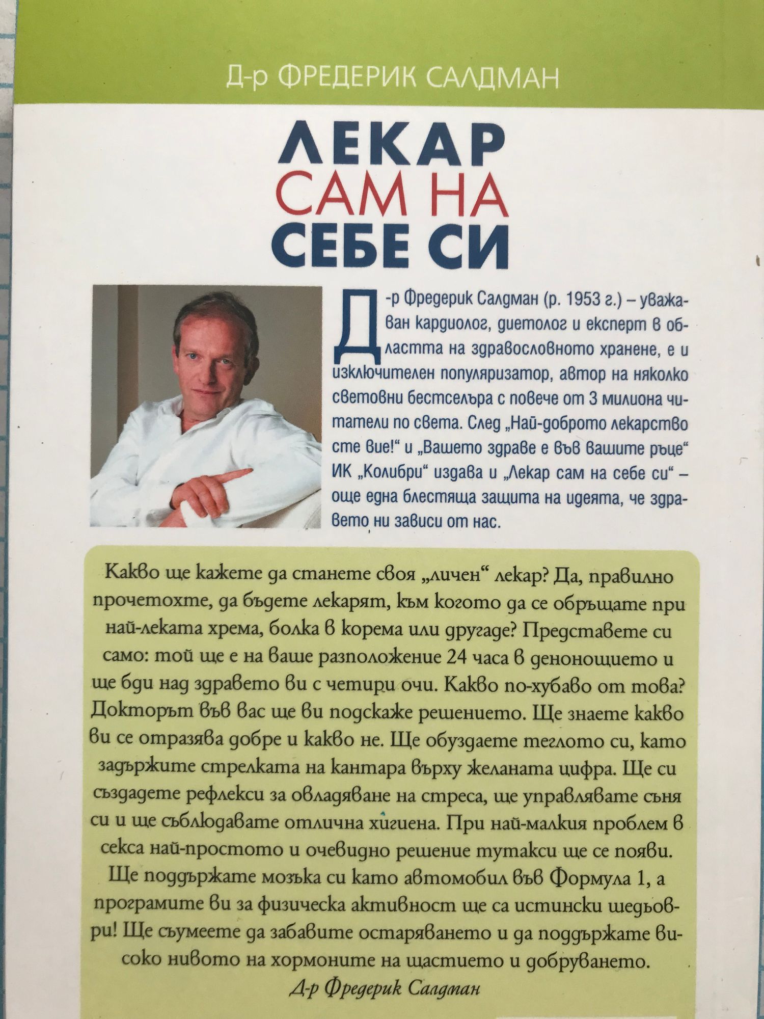Какво ще кажете да станете своят „личен“ лекар? Да, правилно прочетохте, да бъдете лекаря, към когото да се обръщате при най-леката хрема, болка в корема или другаде? Представете си само: той ще е на ваше разположение 24 часа в денонощието и ще бди над здравето ви с четири очи. Какво по-хубаво от това? Докторът във вас ще ви подскаже решението. Ще знаете какво ви се отразява добре и какво не. Ще обуздаете теглото си, като задържите стрелката на кантара върху желаната цифра. Ще си създадете рефлекси за овладяване на стреса, ще управлявате съня си и ще съблюдавате отлична хигиена. При най-малкия проблем в секса най-простото и очевидно решение тутакси ще се появи. Ще поддържате мозъка си като автомобил във Формула 1, а програмите ви за физическа активност ще са истински шедьоври! Ще съумеете да забавите остаряването и да поддържате високо нивото на хормоните на щастието и добруването. Д-р Фредерик Салдман