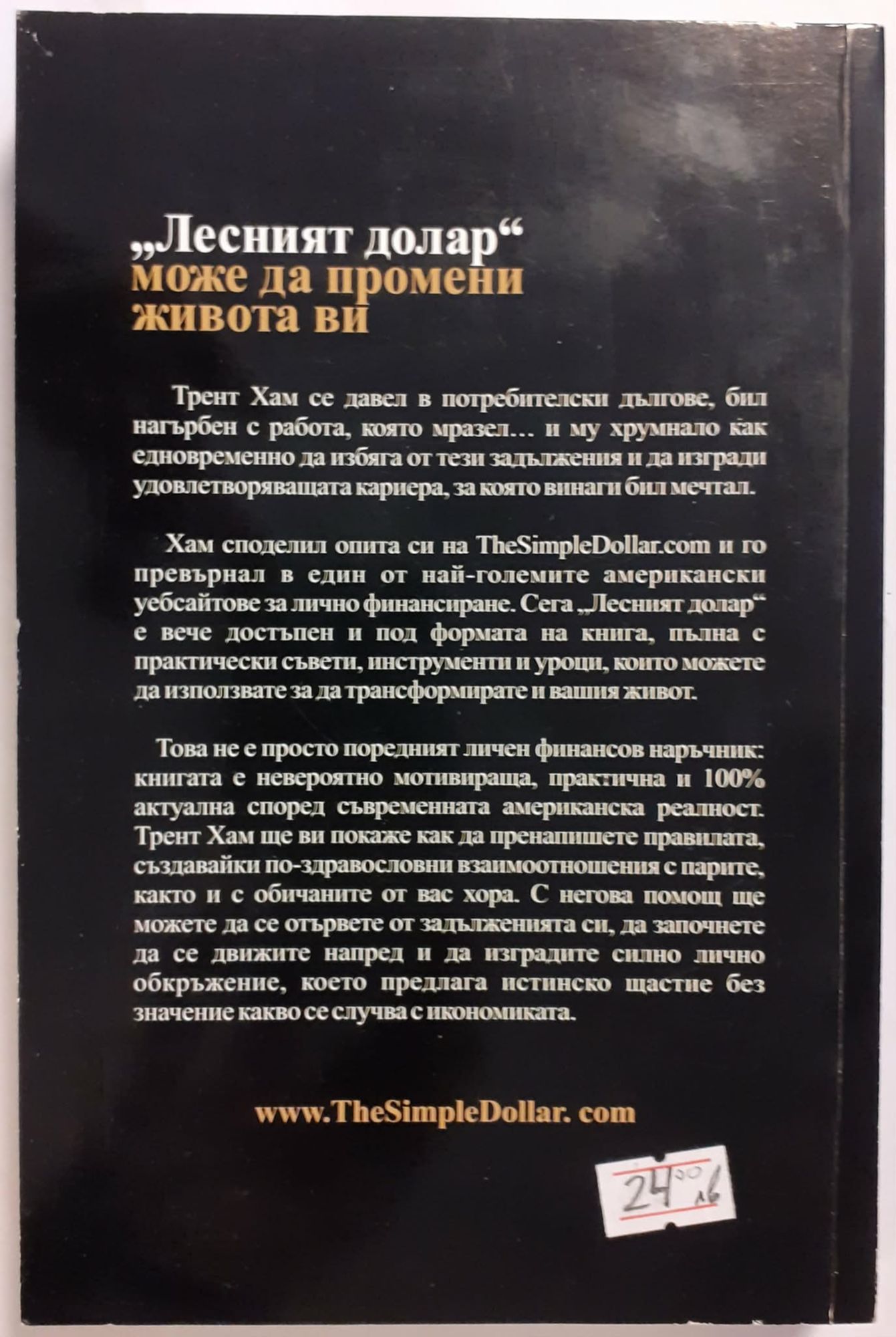 Трент Хам се довел в потребителски дългове, бил нагърбен с работа, която мразел... И му хрумнало как едновременно да избяга от тези задължения и да изгради удовлетворяваща кариера, за която винаги бил мечтал. Хам споделил опита си на TheSimpleDollar.com и го превърна в един от най-големите американски уеб сайтове за лично финансиране. Сега "Лесният долар" е вече достъпен и под формата на книга, пълна с практически съвети, инструменти и уроци, които можете да използвате за да трансформирате и вашия живот. Това е просто поредният личен финансов наръчник: книгата е невероятно мотивираща, практична и 100% актуална според съвременната американска реалност. Трент Хам ще ви покаже как да пренапишете правилата, създавайки по-здравословни взаимоотношения с парите, както и с обичаните от вас хора. С негова помощ ще може да се отървете от задълженията си, да започнете да си движите напред и да изградите силно лично окръжение, което предлага истинско щастие без значение какво се случва с икономиката.
