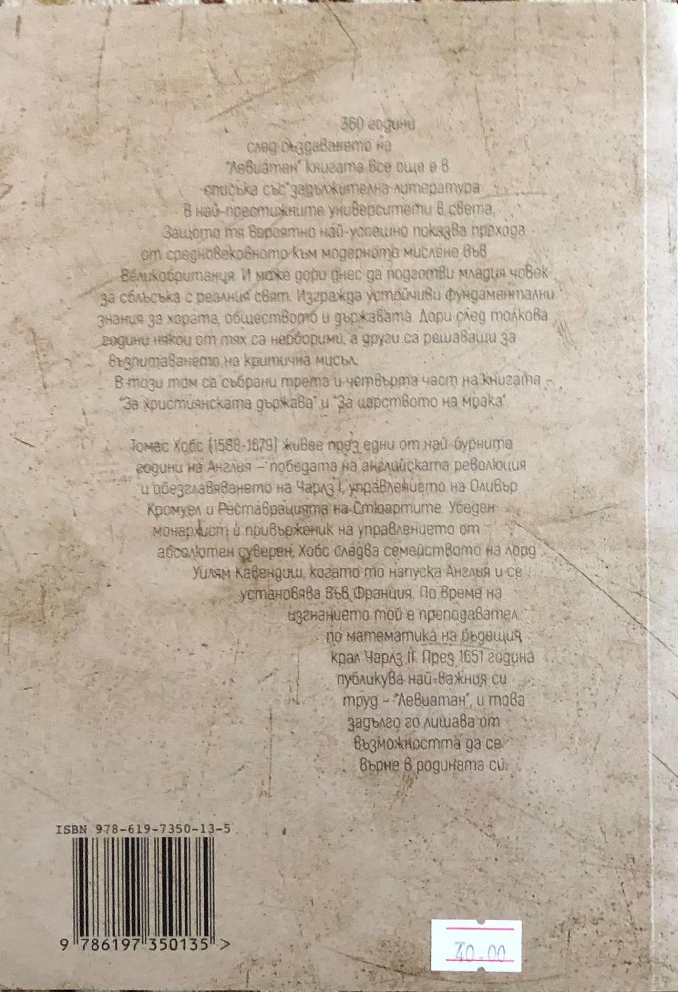 360 години след създаването на „Левиатан”, книгата все още е в списъка със задължителна литература в най-престижните университети в света. Защото тя вероятно най-успешно показва прехода от средновековното към модерното мислене във Великобритания. И може дори днес да подготви младия човек за сблъсъка с реалния свят. Изгражда устойчиви фундаментални знания за хората, обществото и държавата. Дори след толкова години някои от тях са необорими, а други са решаващи за възпитаването на критична мисъл. В този том са събрани третата и четвъртата част на книгата – „За християнската държава” и „За царството на мрака”. Томас Хобс (1588-1679) живее през едни от най-бурните години на Англия – победата на английската революция и обезглавяването на Чарлз I, управлението на Оливър Кромуел и Реставрацията на Стюартите. Убеден монархист и привърженик на управлението от абсолютен суверен, Хобс следва семейството на лорд Уилям Кавендиш, когато то напуска Англия и се установява във Франция. По време на изгнанието той е преподавател по математика на бъдещия крал Чарлз II. През 1651 година публикува най-важния си труд – „Левиатан”, и това задълго го лишава от възможността да се върне в родината си,