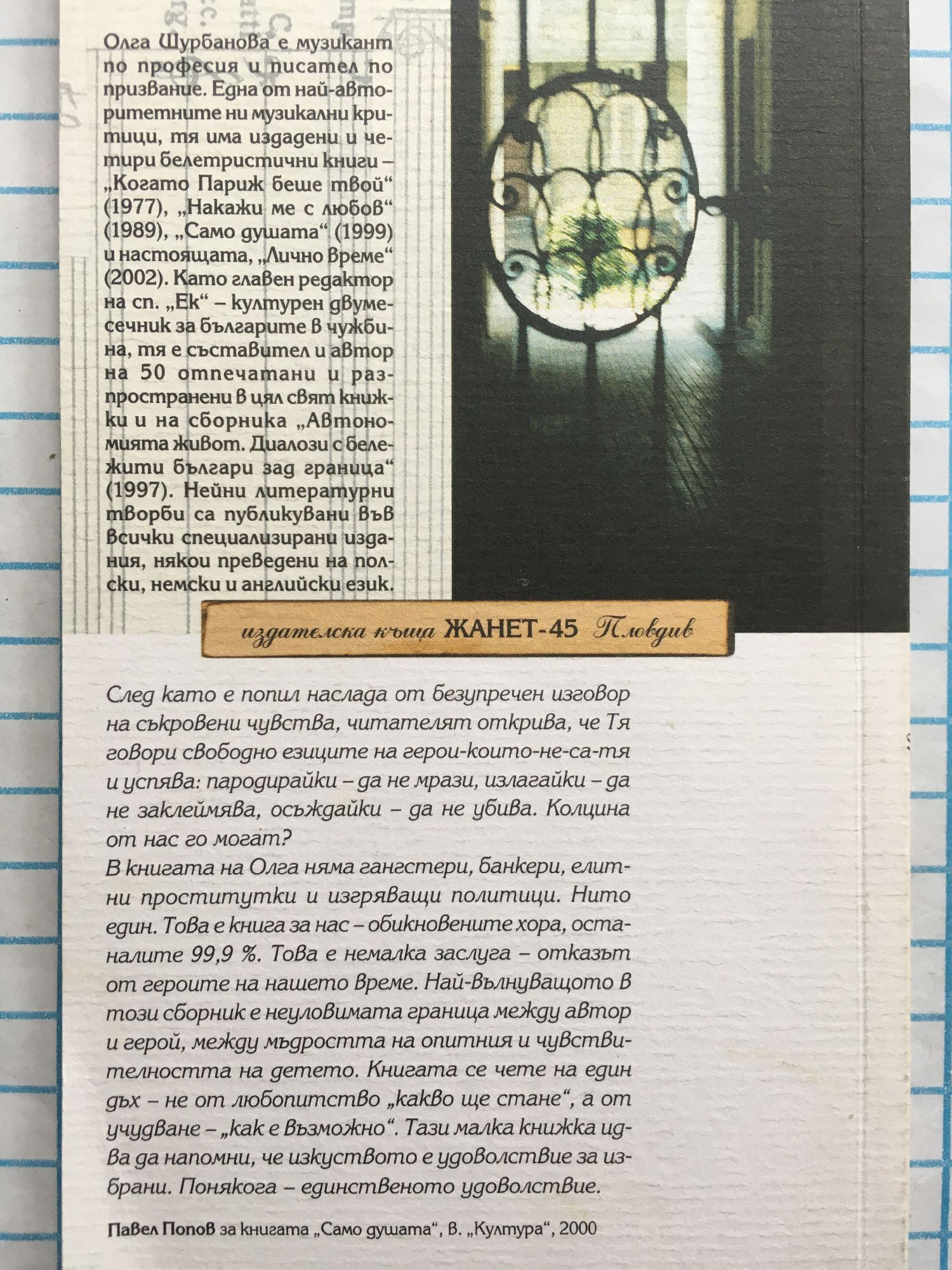 Олга Шурбанова е музикант по професия и писател по призвание. Една от най - авторитетните ни музикални критици, тя има издадени и четири балетристични книги - "Когато Париж беше твой" (1977), "Накажи ме с любов" (1989), "Само душата" (1999) и настоящата , "Лично време" (2002). Като главен редактор на сп. "Ек" - културен двуседмичник за българите в чужбина, тя е съставител и автор на 50 отпечатани и разпространявани по цял свят книжки и на сборника "Автономията живот. Диалози с бележити българи зад граница" (1997). Нейни литературни творби са публикувани във всички специализирани издания, някои преведени на полски, немски и английски език. Съдържание Вкус на Моцарт Сгледа Картината Сватбен марш Старият "Блютнер" Любов Момински тайни Разминаване Ноктюрно