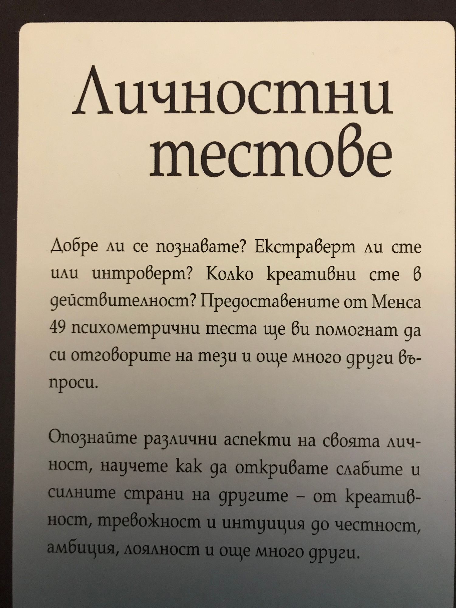 Добре ли се познавате? Екстроверт ли сте или интроверт? Колко креативни сте в действителност? Предоставените от Менса 49 психометрични теста ще ви помогнат да си отговорите на тези и още много други въпроси. Опознайте различни аспекти на своята личност, научете как да откривате слабите и силните страни на другите – от креативност, тревожност и интуиция до честност, амбиция, лоялност и още много други.
