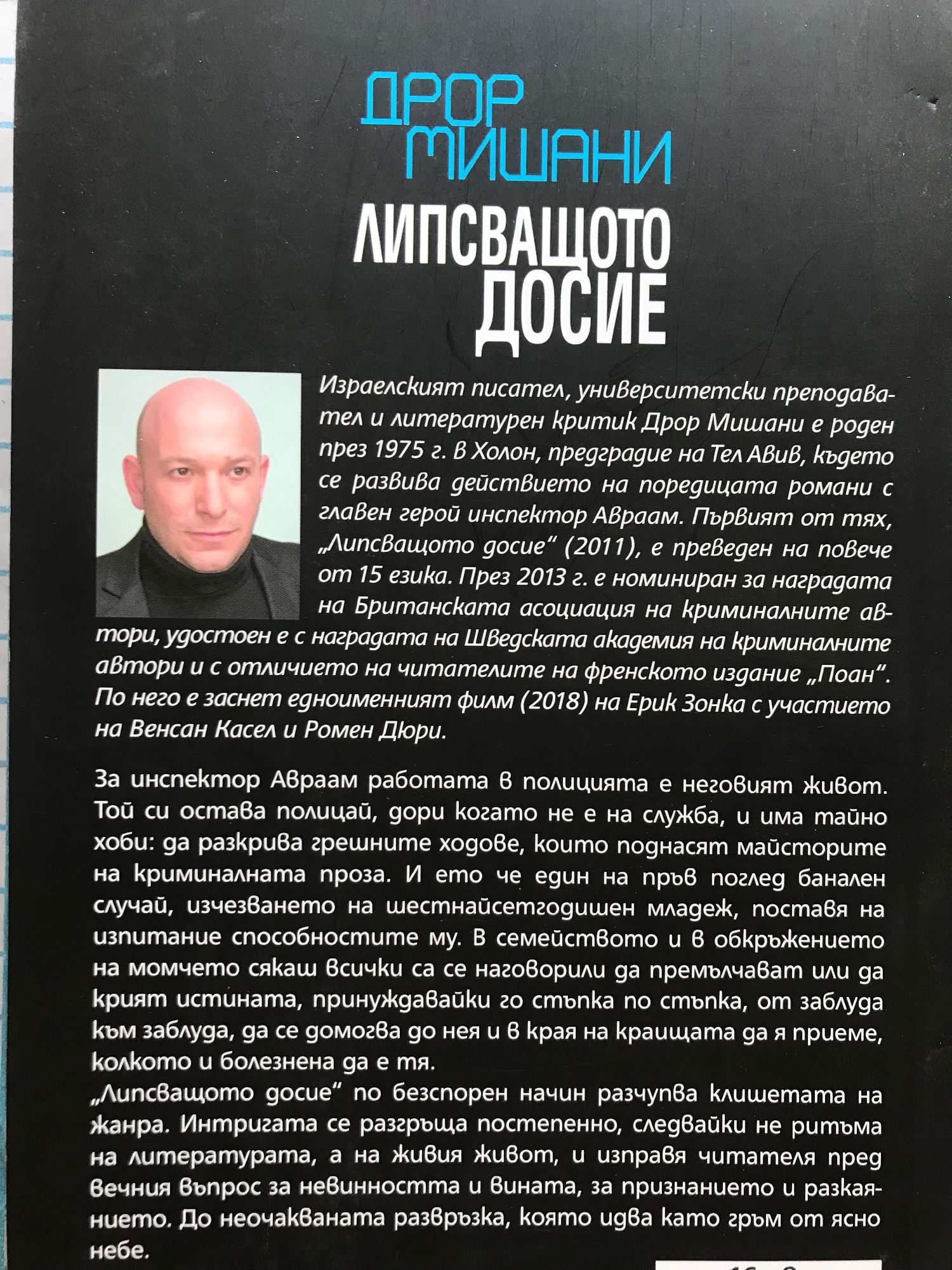 За инспектор Авраам работата в полицията е неговият живот. Той си остава полицай, дори когато не е на служба, и има тайно хоби: да разкрива грешните ходове, които поднасят майсторите на криминалната проза. И ето че един на пръв поглед банален случай, изчезването на шестнайсетгодишен младеж, поставя на изпитание способностите му. В семейството и в обкръжението на момчето сякаш всички са се наговорили да премълчават или да крият истината, принуждавайки го стъпка по стъпка, от заблуда към заблуда, да се домогва до нея и в края на краищата да я приеме, колкото и болезнена да е тя. „Липсващото досие“ по безспорен начин разчупва клишетата на жанра. Интригата се разгръща постепенно, следвайки не ритъма на литературата, а на живия живот, и изправя читателя пред вечния въпрос за невинността и вината, за признанието и разкаянието. До неочакваната развръзка, която идва като гръм от ясно небе.