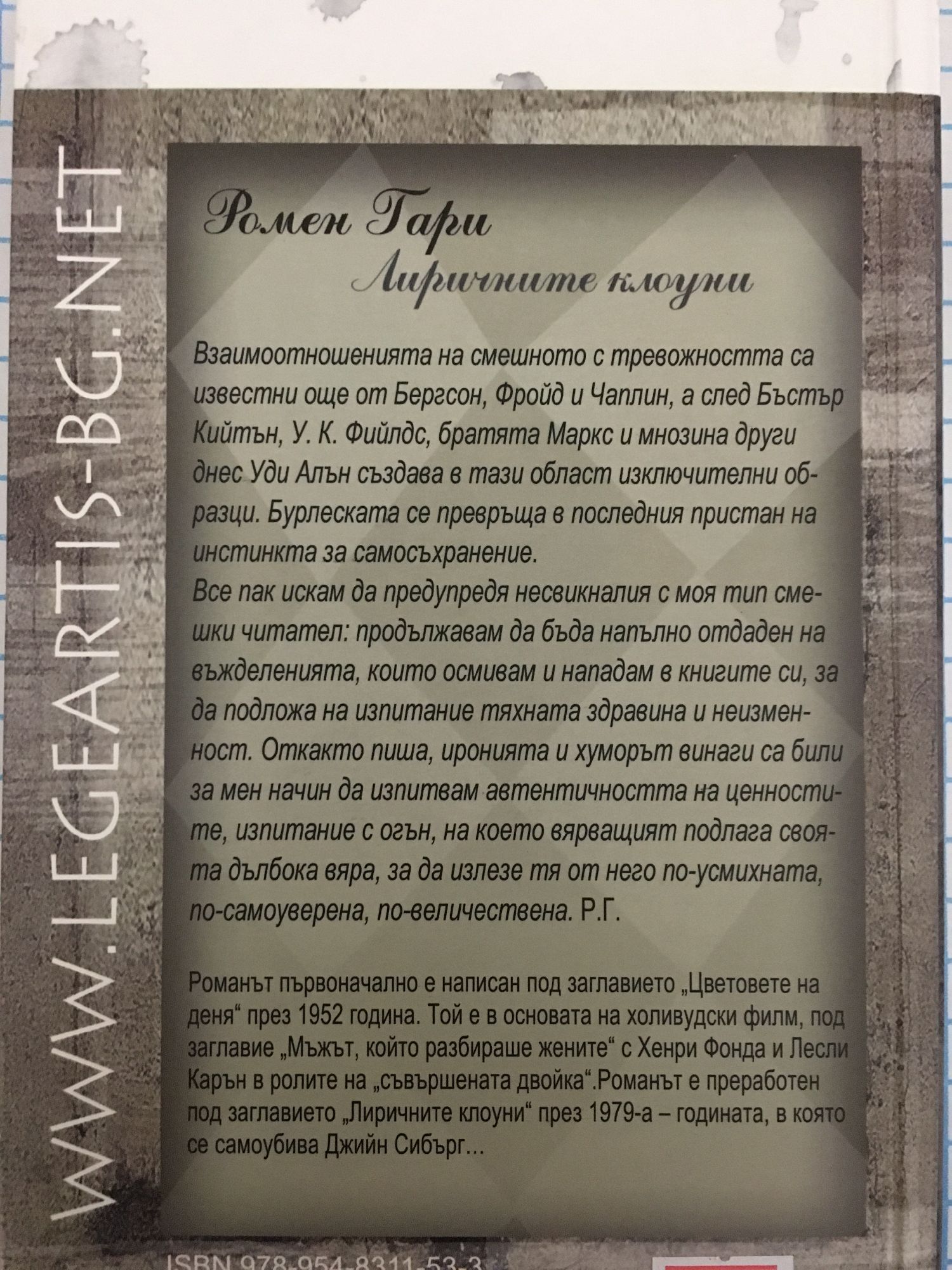 Романът първоначално е написан под заглавието "Цветовете на деня" през 1952 година. Той е в основата на холивудски филм, под заглавие "Мъжът, който разбираше жените" с Хенри Фонда и Лесли Карън в ролите на "съвършената двойка". Романът е преработен под заглавието "Лиричните клоуни" през 1979-а - годината, в която се самоубива Джийн Сибърг... Бурлеската се превръща в последния пристан на инстинкта за самосъхранение.