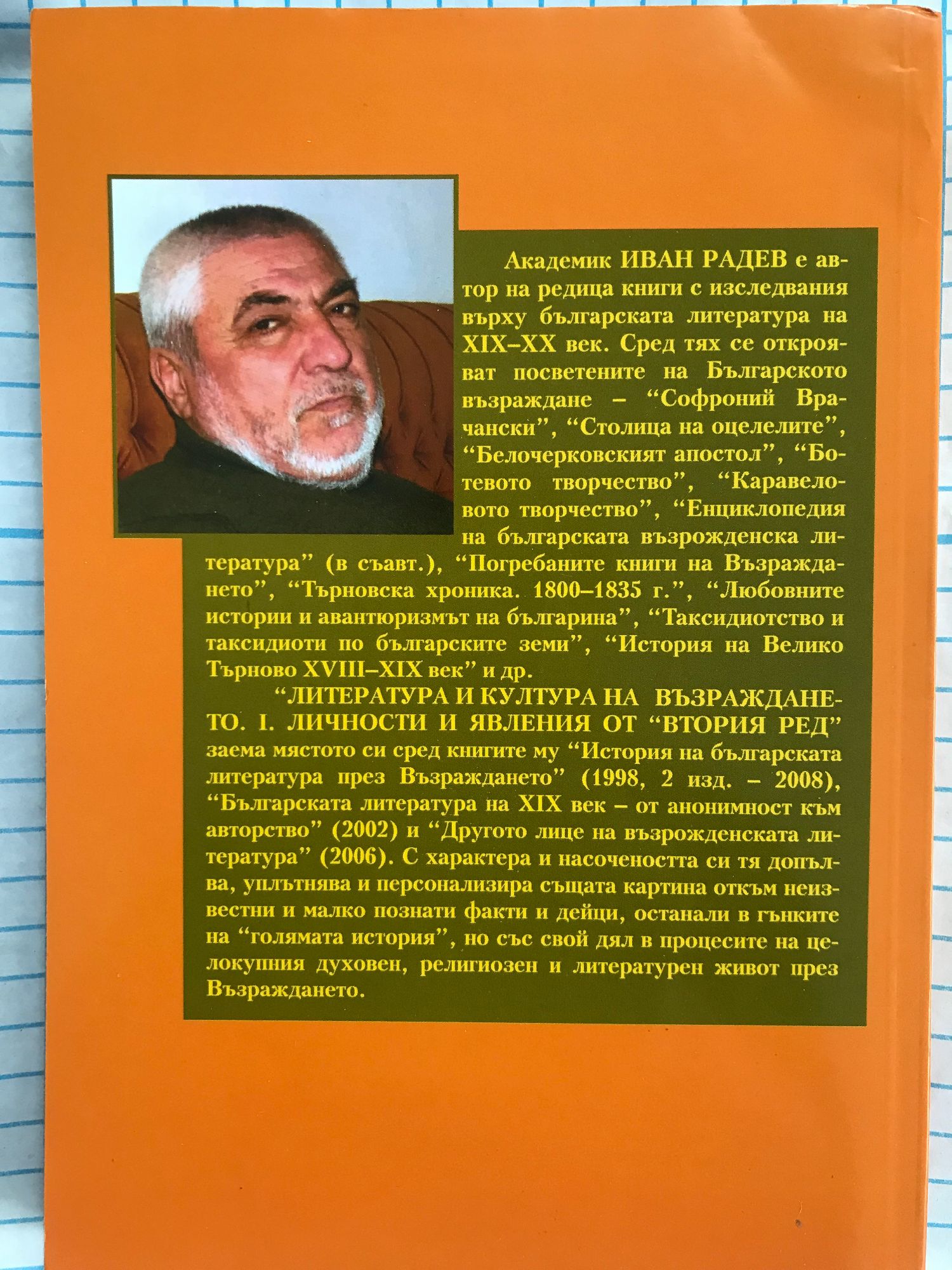 Академик ИВАН РАДЕВ с автор на редица книги с изследвания върху българската литература на XIX—XX век. Сред тях се открояват посветените на Българското възраждане - "Софроний Врачански", "Столица на оцелелите", "Белочерковският апостол", "Ботевото творчество", "Каравеловото творчество", "Енциклопедия на българската възрожденска ли" Погребаните книги на Възраждането. 1800-1835 г.", "Любовните т на българина", "Таксидиотство и таксдиоти по българските земи", "История на Велико Търново ХVІІІ – ХІХ век” и др. "ЛИТЕРАТУРА И КУЛТУРА НА ВЪЗРАЖДАНЕТО. I. ЛИЧНОСТИ И ЯВЛЕНИЯ ОТ "ВТОРИЯ РЕД" заема мястото си сред книгите му "История на българската литература през Възраждането" (1998, 2 изд. - 2008), "Българската литература на XIX век - от анонимност към авторство" (2002) и "Другото лице на възрожденската литература" (2006). С характера и насочеността си тя допълва, уплътнява и персонализира същата картина откъм неизвестни и малко познати факти и дейци, останали в гънките па "голямата история", но със свой дял в процесите на целокупния духовен, религиозен и литературен живот през Възраждането.