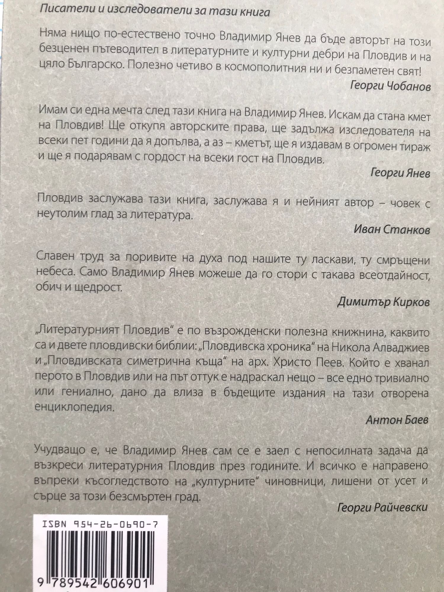 „Няма нищо по-естествено точно Владимир Янев да бъде авторът на този безценен пътеводител в литературните и културни дебри на Пловдив и на цяло Българско. Полезно четиво в космополитния ни и безпаметен свят!” Георги Чобанов „Имам си една мечта след тази книга на Владимир Янев. Искам да стана кмет на Пловдив! Ще откупя авторските права, ще задължа изследователя на всеки пет години да я допълва, а аз - кметът, ще я издавам в огромен тираж и ще я подарявам с гордост на всеки гост на Пловдив.” Георги Янев „Пловдив заслужава тази книга, заслужава я и нейният автор - човек с неутолим глад за литература.” Иван Станков „Славен труд за поривите на духа под нашите ту ласкави, ту смръщени небеса. Само Владимир Янев можеше да го стори с такава всеотдайност, обич и щедрост.” Димитър Кирков „Литературният Пловдив" е по възрожденски полезна книжнина, каквито са и двете пловдивски библии:„Пловдивска хроника" на Никола Алваджиев и „Пловдивската симетрична къща" на арх. Христо Пеев. Който е хванал перото в Пловдив или на път оттук е надраскал нещо - все едно тривиално или гениално, дано да влиза в бъдещите издания на тази отворена енциклопедия.” Антон Баев „Учудващо е, че Владимир Янев сам се е заел с непосилната задача да възкреси литературния Пловдив през годините. И всичко е направено въпреки късогледството на „културните" чиновници, лишени от усет и сърце за този безсмъртен град.” Георги Райчевски