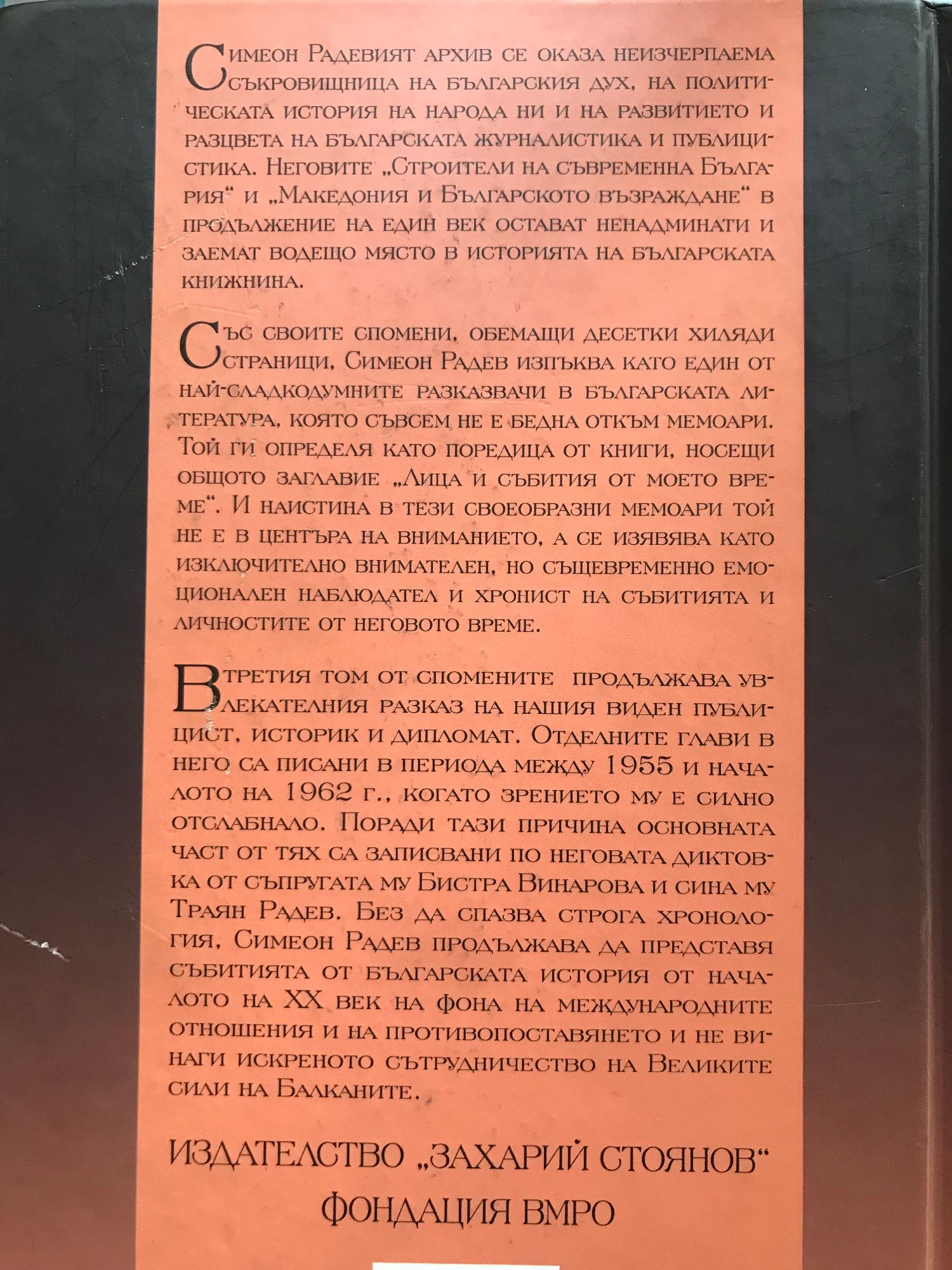В третия том от спомените продължава увлекателния разказ на нашия виден публицист, историк и дипломат. Отделните глави в него са писани в периода между 1955 и началото на 1962 г., когато зрението му е силно отслабнало. Поради тази причина основната част от тях са записвани по неговата диктовка от съпругата му Бистра Винарова и сина му Траян Радев. Без да спазва строга хронология, Симеон Радев продължава да представя събитията от българската история от началото на ХХ век на фона на международните отношения и на противопоставянето и не винаги искреното сътрудничество на Великите сили на Балканите.
