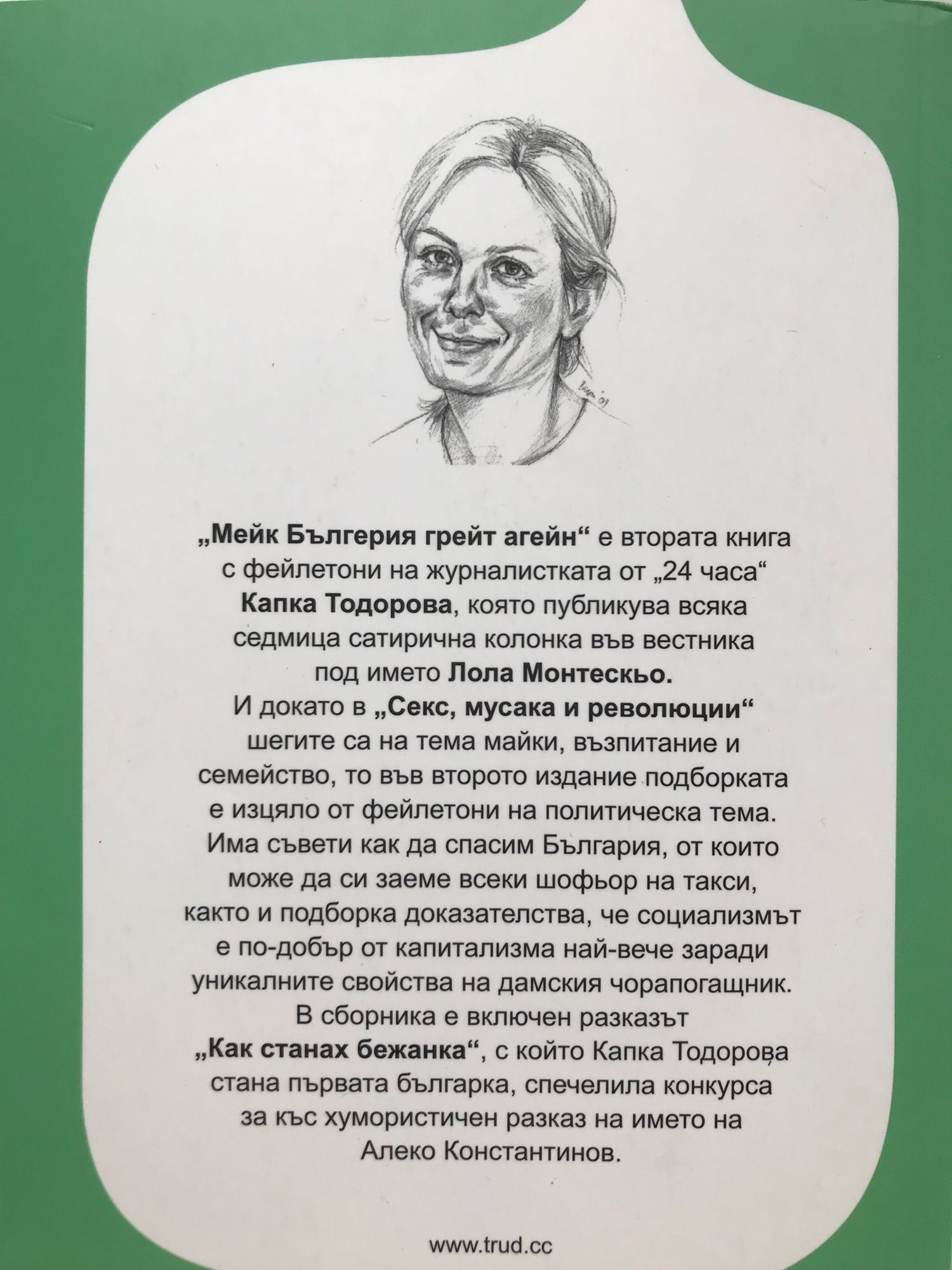 „Мейк Бългерия грейт агейн“ е втората книга с фейлетони на журналистката от „24 часа“ Капка Тодорова, която публикува всяка седмица сатирична колонка във вестника под името Пола Монтескьо. И докато в „Секс, мусака и революции“ шегите са на тема майки, възпитание и семейство, то във второто издание подборката е изцяло от фейлетони на политическа тема. Има съвети как да спасим България, от които може да си заеме всеки шофьор на такси, както и подборка доказателства, че социализмът е по-добър от капитализма най-вече заради уникалните свойства на дамския чорапогащник. В сборника е включен разказът „Как станах бежанка“, с който Капка Тодорова стана първата българка, спечелила конкурса за къс хумористичен разказ на името на Алеко Константинов.