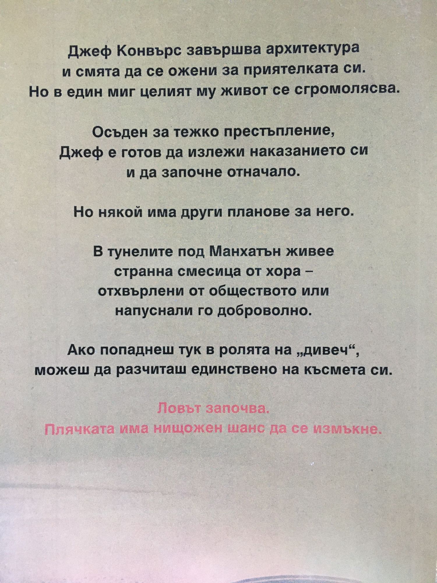 Джеф Конвърс завършва архитектура и смята да се ожени за приятелката си. Но в един миг целият му живот се сгромолясва. Осъден за тежко престъпление, Джеф е готов да излежи наказанието си и да започне отначало. Но някой има други планове за него. В тунелите под Манхатън живее странна смесица от хора - отхвърлени от обществото или напуснали го доброволно. Ако попаднеш тук в ролята на "дивеч", можеш да разчиташ единствено на късмета си.