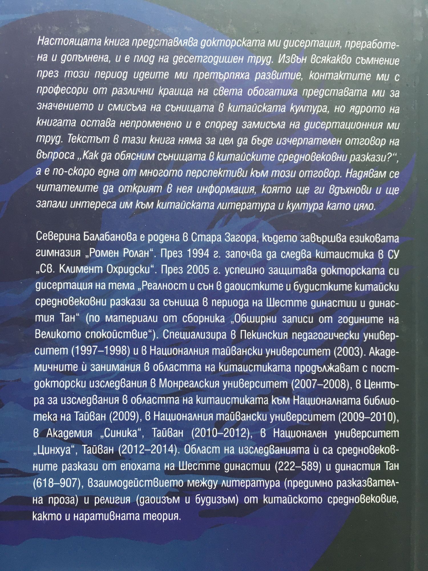 Настоящата книга представлява докторската ми дисертация, преработена и допълнена, и е плод на десетгодишен труд. Извън всякакво съмнение през този период идеите ми претърпяха развитие, контактите ми с професори от различни краища на света обогатиха представата ми за значението и смисъла на сънищата в китайската култура, но ядрото на книгата остава непроменено и е според замисъла на дисертационния ми труд. Текстът в тази книга няма за цел да бъде изчерпателен отговор на въпроса „Как да обясним сънищата в китайските средновековни разкази?“, а е по-скоро една от многото перспективи към този отговор. Надявам се читателите да открият в нея информация, която ще ги вдъхнови и ще запали интереса им към китайската литература и култура като цяло. Северина Балабанова е родена в Стара Загора, където завършва езиковата гимназия „Ромен Ролан“. През 1994 г. започва да следва китаистика в СУ „Св. Климент Охридски“. През 2005 г. успешно защитава докторската си дисертация на тема „Реалност и сън в даоистките и будистките китайски средновековни разкази за сънища в периода на Шестте династии и династия Тан“ (по материали от сборника „Обширни записи от годините на Великото спокойствие“). Специализира в Пекинския педагогически университет (1997–1998) и в Националния тайвански университет (2003). Академичните ѝ занимания в областта на китаистиката продължават с постдокторски изследвания в Монреалския университет (2007–2008), в Центъра за изследвания в областта на китаистиката към Националната библиотека на Тайван (2009), в Националния тайвански университет (2009–2010), в Академия „Синика“, Тайван (2010–2012), в Национален университет „Цинхуа“, Тайван (2012–2014). Област на изследванията ѝ са средновековните разкази от епохата на Шестте династии (222–589) и династия Тан (618–907), взаимодействието между литература (предимно разказвателна проза) и религия (даоизъм и будизъм) от китайското средновековие, както и наративната теория.