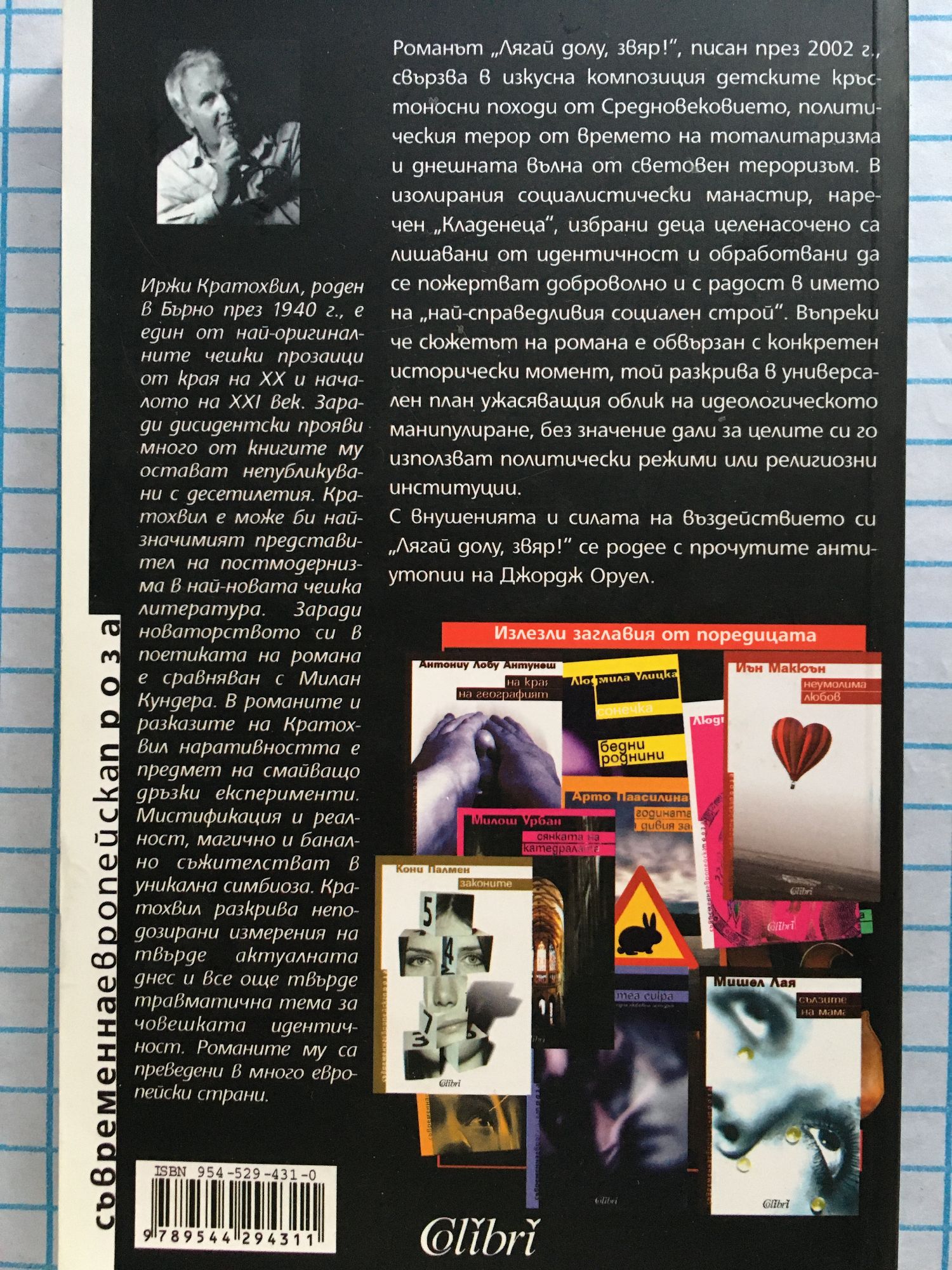 Романът “Лягай долу, звяр!”, писан през 2002 г., свързва в изкусна композиция детските кръстоносни походи от Средновековието, политическия терор от времето на тоталитаризма и днешната вълна от световен тероризъм. В изолирания социалистически манастир, наречен “Кладенеца”, избрани деца целенасочено са лишавани от идентичност и обработвани да се пожертват доброволно и с радост в името на “най-справедливия социален строй”. Въпреки че сюжетът на романа е обвързан с конкретен исторически момент, той разкрива в универсален план ужасяващия облик на идеологическото манипулиране, без значение дали за целите си го използват политически режими или религиозни институции. С внушенията и силата на въздействието си “Лягай долу, звяр!” се родее с прочутите антиутопии на Джордж Оруел.