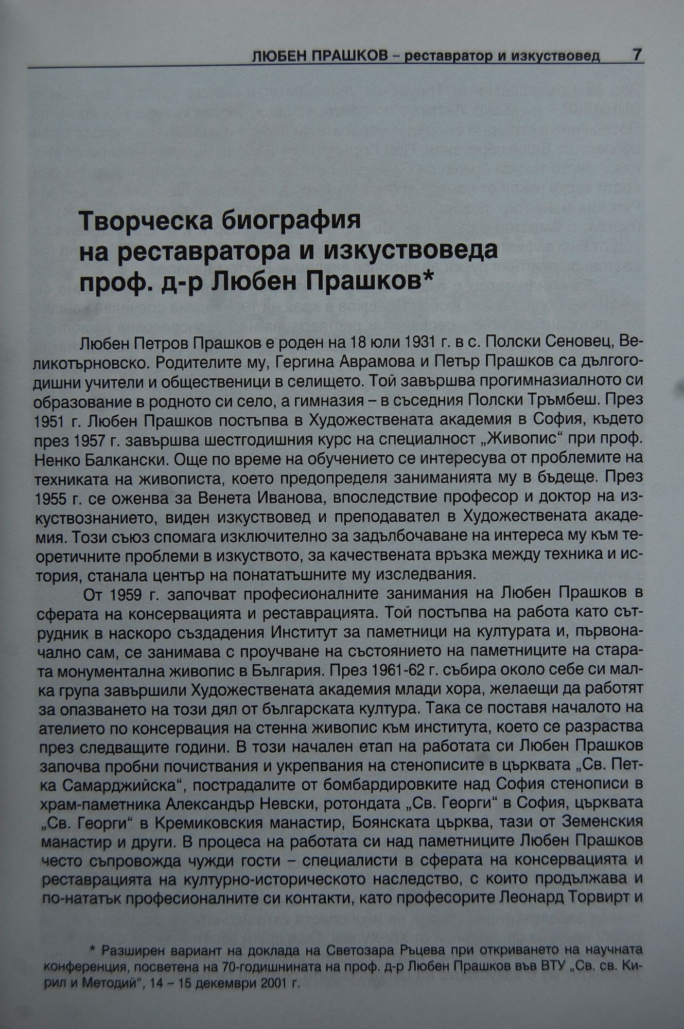 Материали от научната конференция, посветена на 70-годишнината на проф. д-р Любен Прашков, проведена във ВТУ "Св. св. Кирил и Методий", 14-15 декември 2001 г