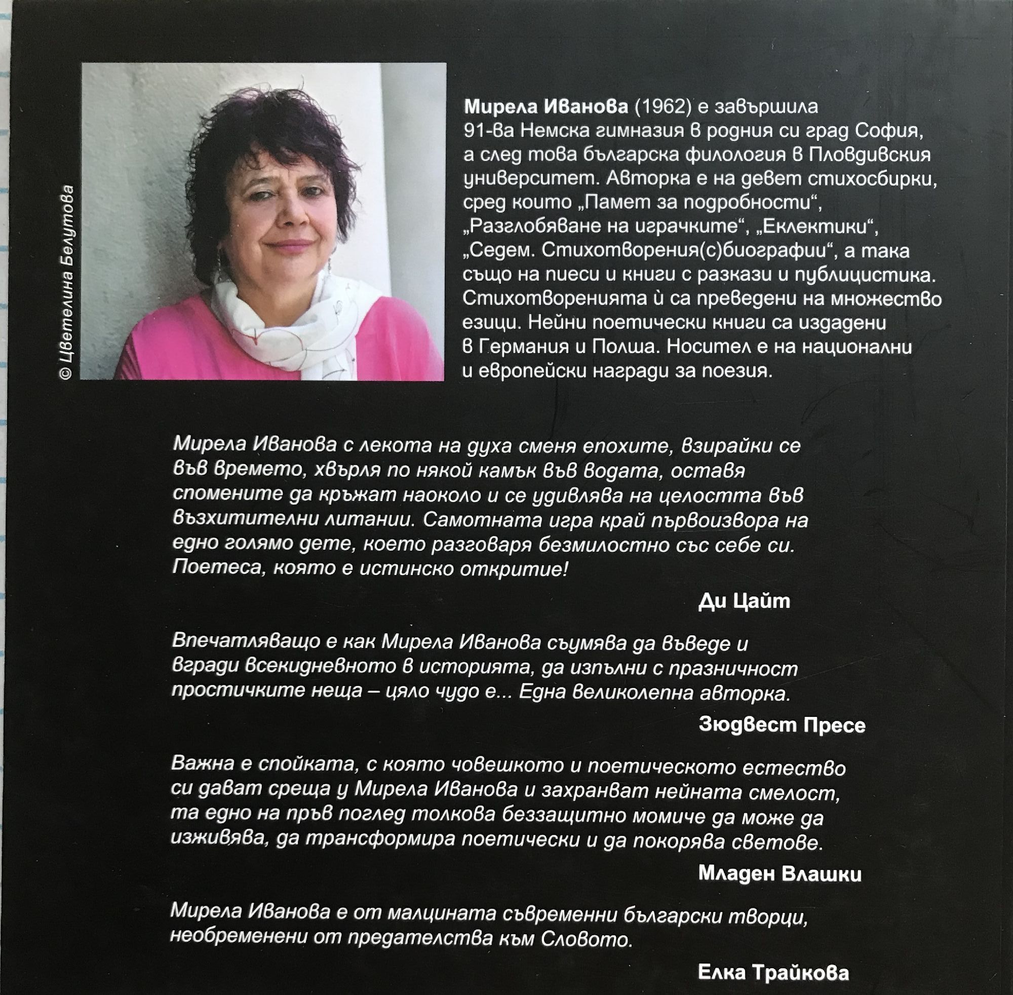 Мирела Иванова с лекота на духа сменя епохите, взирайки се във времето, хвърля по някой камък във водата, оставя спомените да кръжат наоколо и се удивлява на целостта във възхитителни литании. Самотната игра край първоизвора на едно голямо дете, което разговаря безмилостно със себе си. Поетеса, която е истинско откритие! Ди Цайт Впечатляващо е как Мирела Иванова съумява да въведе и вгради всекидневното в историята, да изпълни с празничност простичките неща – цяло чудо е... Една великолепна авторка. Зюдвест Пресе Важна е спойката, с която човешкото и поетическото естество си дават среща у Мирела Иванова и захранват нейната смелост, та едно на пръв поглед толкова беззащитно момиче да може да изживява, да трансформира поетически и да покорява светове. Младен Влашки Мирела Иванова е от малцината съвременни български творци, необременени от предателства към Словото. Елка Трайкова