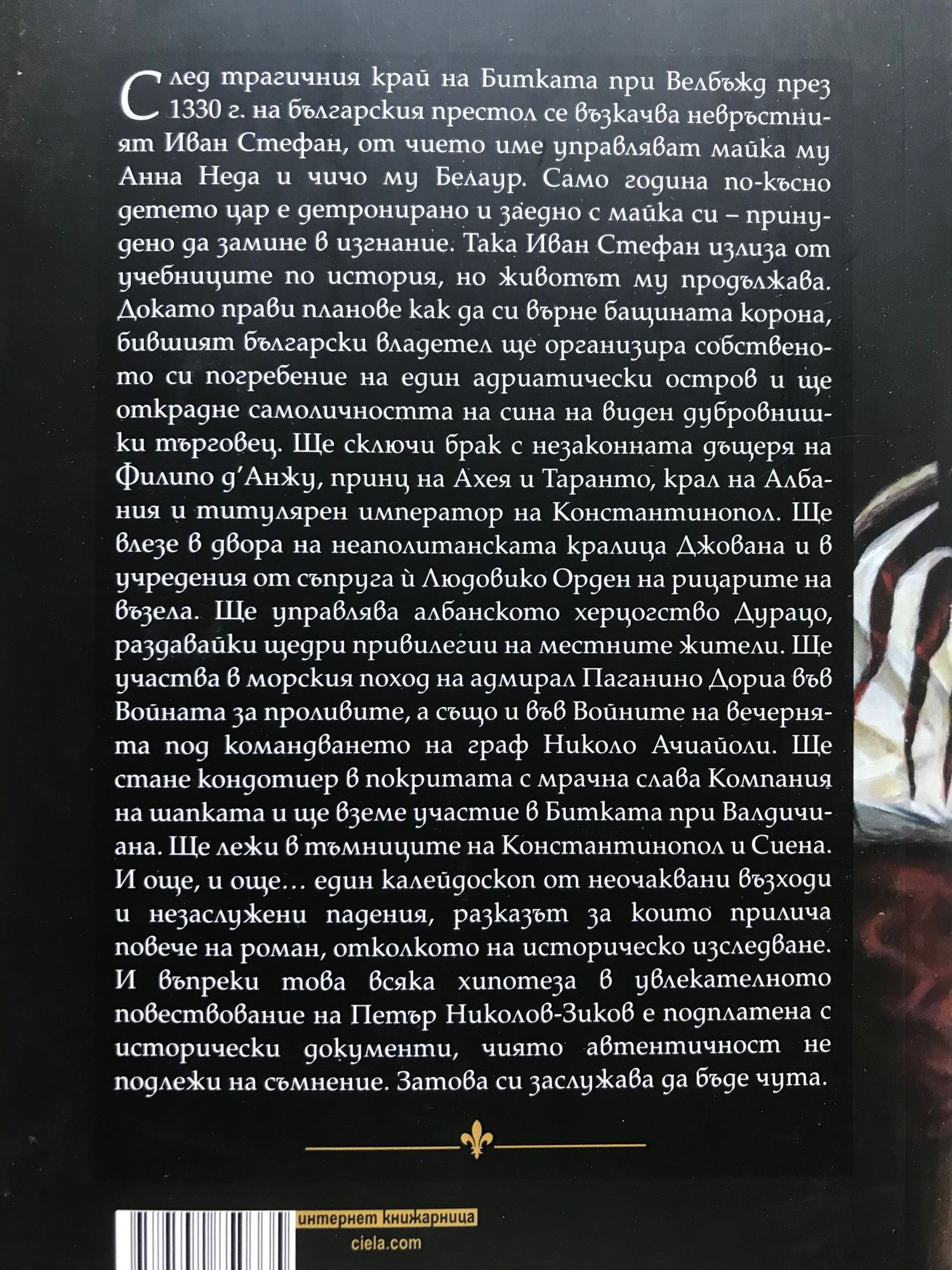 След трагичния край на Битката при Велбъжд през 1330 г. на българския престол се възкачва невръстният Иван Стефан, от чието име управляват майка му Анна Неда и чичо му Белаур. Само година по-късно детето цар е детронирано и заедно с майка си – принудено да замине в изгнание. Така Иван Стефан излиза от учебниците по история, но животът му продължава. Докато прави планове как да си върне бащината корона, бившият български владетел ще организира собственото си погребение на един адриатически остров и ще открадне самоличността на сина на виден дубровнишки търговец. Ще сключи брак с незаконната дъщеря на Филипо д‘Анжу, принц на Ахея и Таранто, крал на Албания и титулярен император на Константинопол. Ще влезе в двора на неаполитанската кралица Джована и в учредения от съпруга ? Людовико Орден на рицарите на възела. Ще управлява албанското херцогство Дурацо, раздавайки щедри привилегии на местните жители. Ще участва в морския поход на адмирал Паганино Дориа във Войната за проливите, а също и във Войните на вечернята под командването на граф Николо Ачиайоли. Ще стане кондотиер в покритата с мрачна слава Компания на шапката и ще вземе участие в Битката при Валдичиана. Ще лежи в тъмниците на Константинопол и Сиена. И още, и още… един калейдоскоп от неочаквани възходи и незаслужени падения, разказът за които прилича повече на роман, отколкото на историческо изследване. И въпреки това всяка хипотеза в увлекателното повествование на Петър Николов-Зиков е подплатена с множество исторически документи, чиято автентичност не подлежи на съмнение. Затова си заслужава да бъде чута.