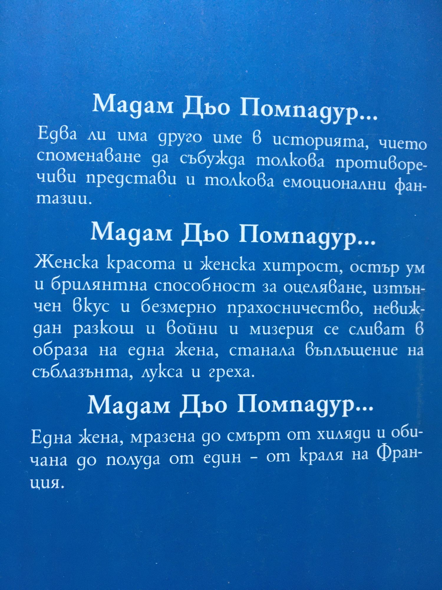 Едва ли има друго име в историята, чието споменаване да събужда толкова противоречиви представи и толкова емоционални фантазии. Мадам Дьо Помпадур... Женска красота и женска хитрост, остър ум и брилянтна способност за оцеляване, изтънчен вкус и безмерно прахосничество, невиждан разкош и войни и мизерия се сливат в образа на една жена, станала въплъщение на съблазънта, лукса и греха. Мадам Дьо Помпадур... Една жена, мразена до смърт от хиляди и обичана до полуда от един - от краля на Франция.