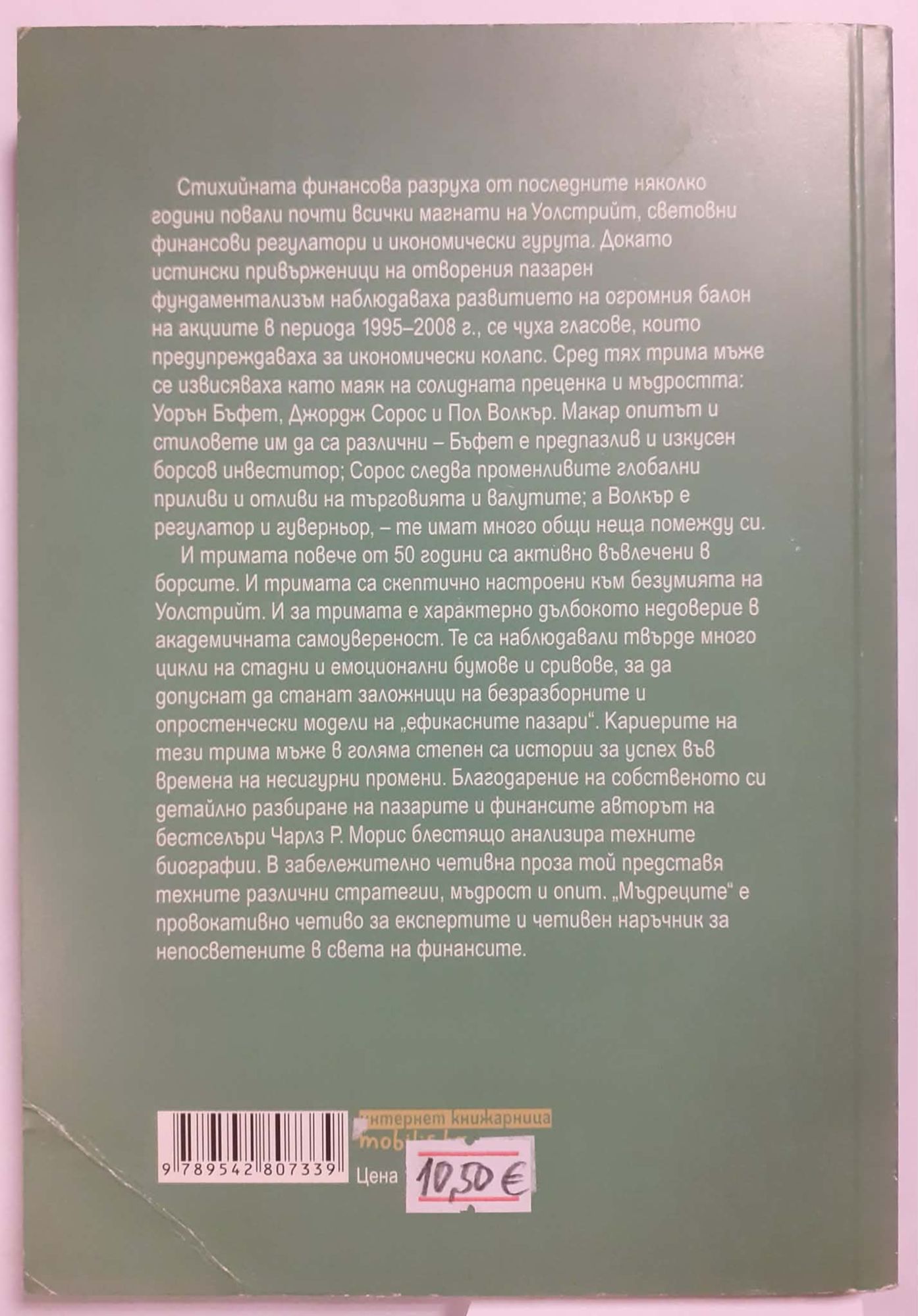 Стихийната финансова разруха от последните няколко години повали почти всички магнати на Уолстрийт, световни финансови регулатори и икономически гурута. Докато истински привърженици на отворения пазарен фундаментализъм наблюдаваха развитието на огромния балон на акциите в периода 1995–2008 г., се чуха гласове, които предупреждаваха за икономически колапс. Сред тях трима мъже се извисяваха като маяк на солидната преценка и мъдростта: Уорън Бъфет, Джордж Сорос и Пол Волкър. Макар опитът и стиловете им да са различни – Бъфет е предпазлив и изкусен борсов инвеститор; Сорос следва променливите глобални приливи и отливи на търговията и валутите; а Волкър е регулатор и гуверньор, – те имат много общи неща помежду си.И тримата повече от 50 години са активно въвлечени в борсите. И тримата са скептично настроени към безумията на Уолстрийт. И за тримата е характерно дълбокото недоверие в академичната самоувереност. Те са наблюдавали твърде много цикли на стадни и емоционални бумове и сривове, за да допуснат да станат заложници на безразборните и опростенчески модели на „ефикасните пазари“. Кариерите на тези трима мъже в голяма степен са истории за успех във времена на несигурни промени. Благодарение на собственото си детайлно разбиране на пазарите и финансите авторът на бестселъри Чарлз Р. Морис блестящо анализира техните биографии. В забележително четивна проза той представя техните различни стратегии, мъдрост и опит. „Мъдреците“ е провокативно четиво за експертите и четивен наръчник за непосветените в света на финансите.