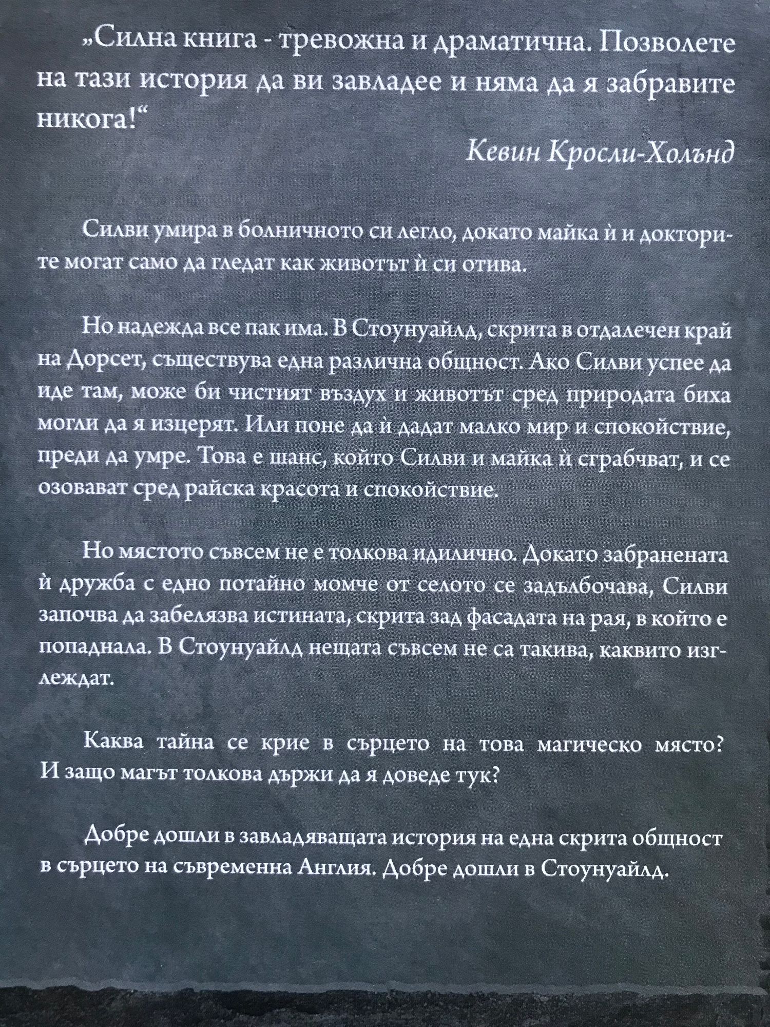 Силви умира в болничното си легло, докато майка й и докторите могат само да гледат как животът й си отива. Но надежда все пак има. В Стоунуайлд, скрита в отдалечен край на Дорсет, съществува една различна общност. Ако Силви успее да иде там, може би чистият въздух и животът сред природата биха могли да я изцерят. Или поне да й дадат малко мир и спокойствие, преди да умре. Това е шанс, който Силви и майка й сграбчват, и се озовават сред райска красота и спокойствие. Но мястото съвсем не е толкова идилично. Докато забранената й дружба с едно потайно момче от селото се задълбочава, Силви започва да забелязва истината, скрита зад фасадата на рая, в който е попаднала. В Стоунуайлд нещата съвсем не са такива, каквито изглеждат. Каква тайна се крие в сърцето на това магическо място? И защо магът толкова държи да я доведе тук? Добре дошли в завладяващата история на една скрита общност в сърцето на съвременна Англия. Добре дошли в Стоунуайлд.