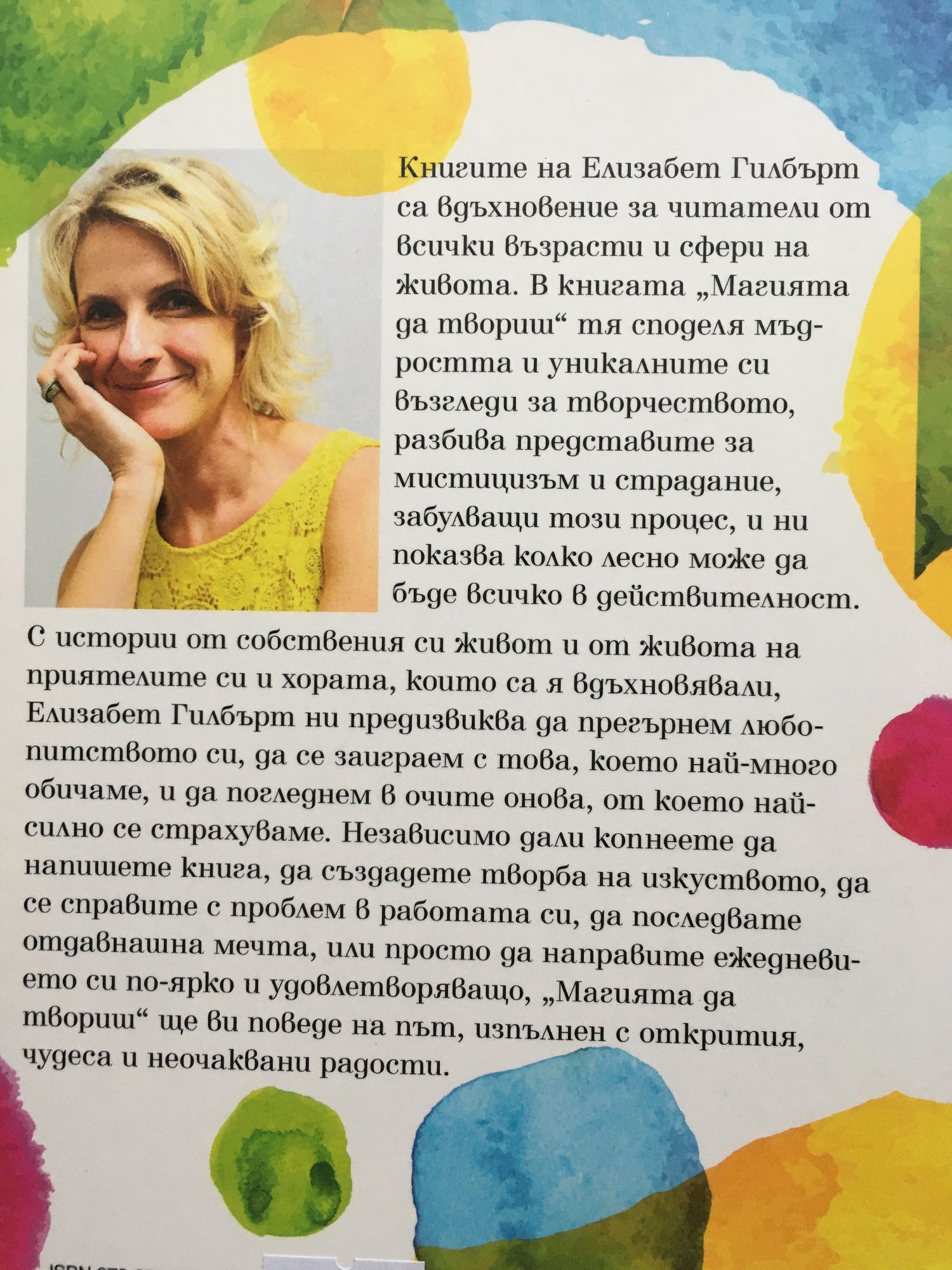 Книгите на Елизабет Гилбърт са вдъхновение за читатели от всички възрасти и сфери на живота. В книгата "Магията да твориш" тя споделя мъдростта и уникалните си възгледи за творчеството, разбива представите за мистицизъм и страдание, забулващи този процес, и ни показва колко лесно може да бъде всичко в действителност. С истории от собствения си живот и от живота на приятелите си и хората, които са я вдъхновявали, Елизабет Гилбърт ни предизвиква да прегърнем любопитството си, да се заиграем с това, което най-много обичаме, и да погледнем в очите онова, от което най-силно се страхуваме. Независимо дали копнеете да напишете книга, да създадете творба на изкуството, да се справите с проблем в работата си, да направите ежедневието си по-ярко и удовлетворяващо, "Магията да твориш" ще ви поведе на път, изпълнен с открития, чудеса и неочаквани радости.