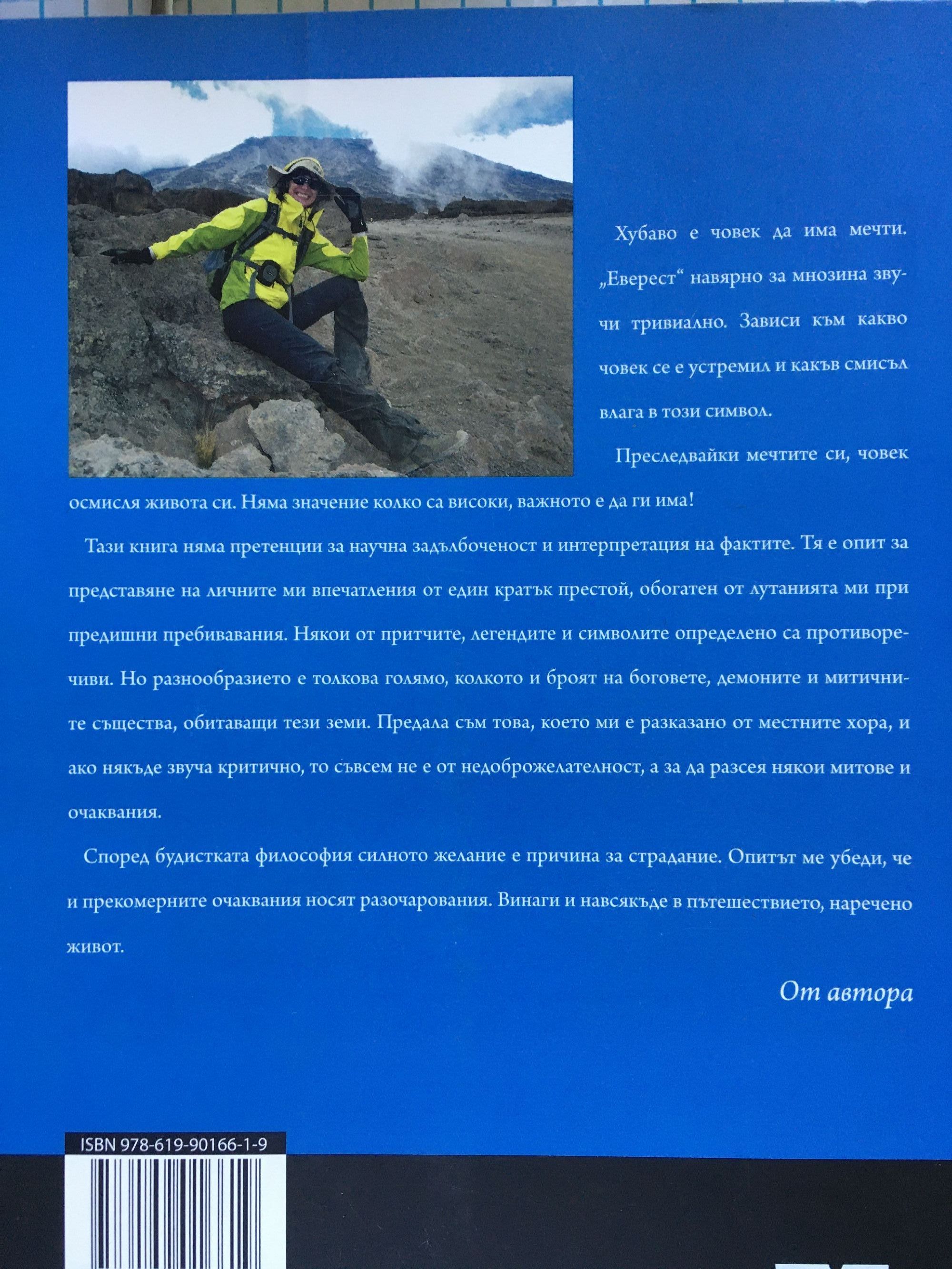 Хубаво е човек да има мечти. "Еверест" навярно за мнозина звучи тривиално. Зависи към какво човек се е устремил и какъв смисъл влага в този символ. Преследвайки мечтите си, човек осмисля живота си. Няма значение колко са високи, важното е да ги има! Тази книга няма претенции за научна задълбоченост и интерпретация на фактите. Тя е опит за представяне на личните ми впечатления от един кратък престой, обогатен от лутанията ми при предишни пребивавания. Някои от притчите, легендите и символите определено са противоречиви. Но разнообразието е толкова голямо, колкото и броят на боговете, демоните и митичните същества, обитаващи тези земи. Предала съм това, което ми е разказано от местните хора, и ако някъде звуча критично, то съвсем не е от недоброжелателност, а за да разсея някои митове и очаквания. Според будистката философия силното желание е причина за страдание. Опитът ме убеди, че и прекомерните очаквания носят разочарования. Винаги и навсякъде в пътешествието, наречено живот. От автора