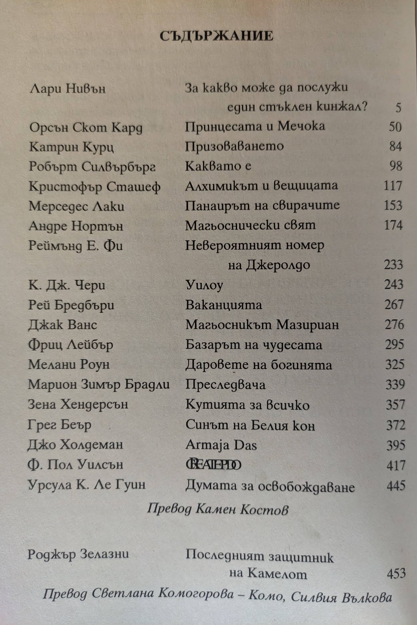 от Рей Бредбъри, Лари Нивън, Орсън Скот Кард, Андре Нортън, Урсула Ле Гуин, Роджър Зелазни, Катрин Курц, Робърт Силвърбърг, Кристофър Сташеф, Мерседес Лаки, К. Дж. Чери, Джак Ванс, Фриц Лейбър, Мелани Роун, Марион Зимър Брадли, Зена Хендерсън, Грег Беър, Джо Холдеман, Пол Уилсън, Реймънд Фийст